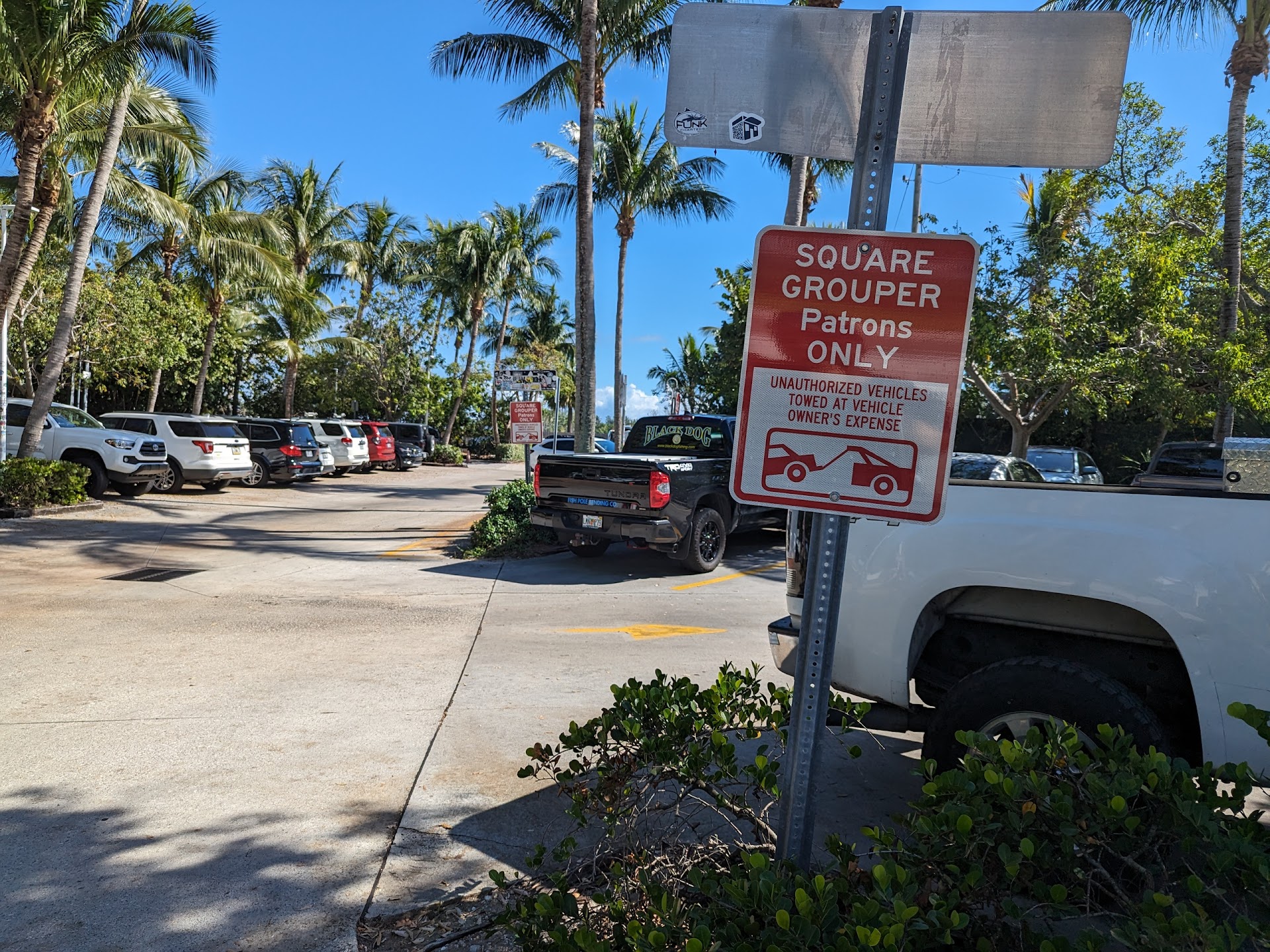 Read moreWe stopped in for lunch. Navigation brought us to a narrow street that ended in the Square Grouper's tiny parking lot. Construction activity was underway and many parking spaces were coned off. Our unwelcoming first impression was the presence of many Tow Away signs. It took us 15 minutes just to drive down each row looking for parking. Other cars were rudely camping behind a car they thought may be leaving soon and blocking the row for everyone else. As we arrived at least half a dozen other vehicles were also hunting for parking in the little lot. Frustrated, we drove away. But then we found a good solution. A free public parking lot was 2 blocks away on Love Street. My tip is to just go to that lot first to park and walk the short distance to avoid the parking lot mess that's on Square Grouper property. My suggestion to management is to take down some of the Tow Away signs and put something up advising of the free lot nearby. We got a table with a great view of the Loxahatchee River and Jupiter Inlet. It was a very warm November afternoon but was comfortable at the table in the tiki bar area. The vibe at the tiki bar was fantastic. We ordered beer (Contraband IPA by Tequesta Brewing, it's really good) and lunch. The grouper and chips were great. The hamburgers were very good. My tip on ordering food at any place with "Grouper" in the name is to order the grouper and you'll be delighted as I was here. Service is minimalistic; but it's one step up from pointing your phone at a barcode and that whole drill. Here, you order food at the bar. The barmaid gives you a beeper and when it goes off, you pick it up at the to-go window. The process worked for us and was easy. At least the barmaid opened the beer bottles (drought is not available) and handed them to us. We loved the food, especially the grouper. Also, the salad that is substitutable for fries with the burgers was...