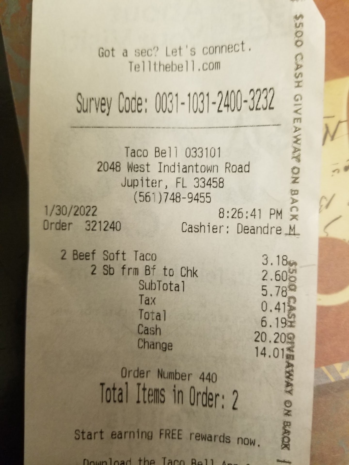 Read more12/21/21 3 years ago I gave this place 5 stars. Now, I avoid this place completely. Kept giving it a chance to redeem itself. Save your money. Pay a little more for the other Indiantown Taco Bell across from the movies. Manager needs to fix their incompetent employee problems first.