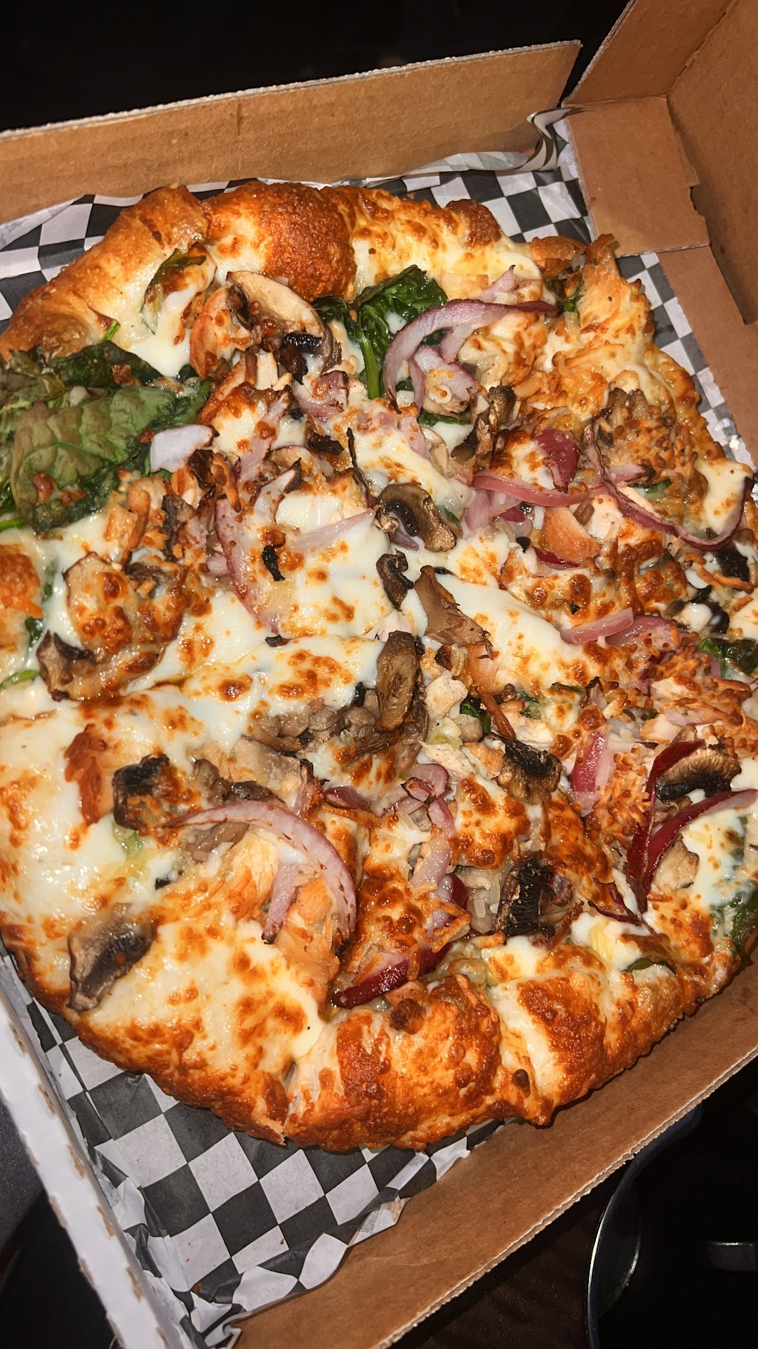 BARBARY COAST Pizza Sauce, Mozzarella, Mushrooms, Spinach, Tomato, Garlic, Feta Cheese and Herb.