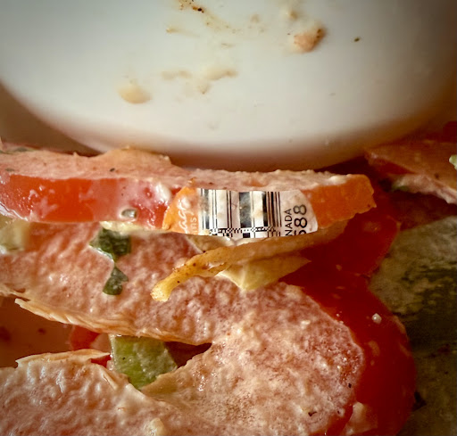 Up next - the main issue that has caused me to never consider returning. I ordered their BBQ chicken salad. At first I was enjoying it bc the flavor was great and chicken tender - was initially very nice. Until I found that they left the stickers on the bell peppers in the salad - cut right through them - edges all shredded (see photo). Do they even wash their salad veggies?? How much of the sticker did I eat?? THOSE STICKERS ARE MADE OF VINYL!! Disgusting! Now I’ll be scouring every salad I ever eat to make sure I’m not eating the dang stickers so thanks for that I guess.