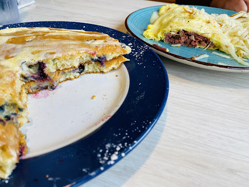 The food actually looked fairly okay once it arrived. I had chicken and waffles, as a skillet. There was a bed of hash browns and bacon bits, a layer of chicken and waffle chunks, and then my scrambled eggs on top. What appeared to be quite appetizing turned out to be a poorly constructed plate. The eggs were alright, but not the fluffy goodness I typically expect when ordering a scrambled egg. Underneath, the single chicken strip they used was clearly reheated in the oven. I could not tell if it was frozen Tyson chicken, or if it was made a night or two before. Regardless, I was pretty displeased by the texture. If you don't have the ability to make a food fresh, don't serve it! The waffle pieces underneath were already coated in sugar, which ruined the texture. The sweetness also felt out of place with the savory components around it. Hash browns on the bottom were quite soggy, and not very warm by the time I got to them (I eat quite quickly, it was only about 3-4 minutes after the plate had made its way to the table). Not to mention the sugar crystals fell into the potatoes, leaving a mess of sweetness. In fact, I would bet there was more sugar in the potatoes than salt. Instead of toast, I had ordered a lemon curd blue berry pancake, which was actually alright. Nothing to write home about, but it was at least well thought out.