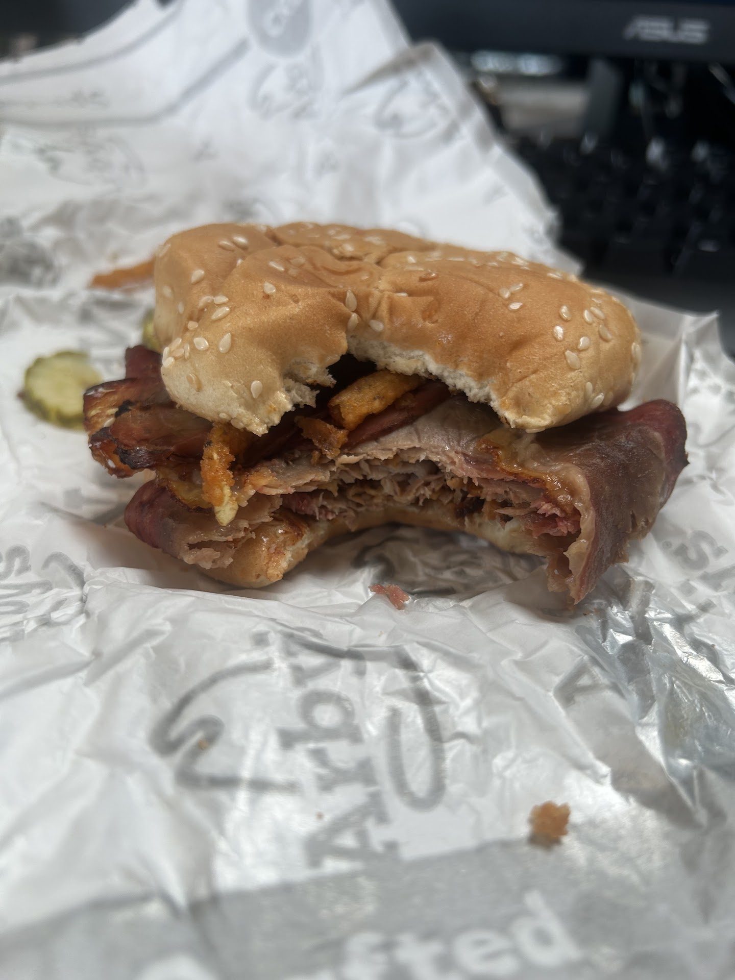 What’s more - not A SINGLE DAMN drop of BBQ sauce. How hard is it to put on one of the four main ingredients? Bun, meat, sauce, pickles - oh yeah, a 5th item…fried onions, like the type used for a Green Bean Casserole (which, honestly, I would have rather had).