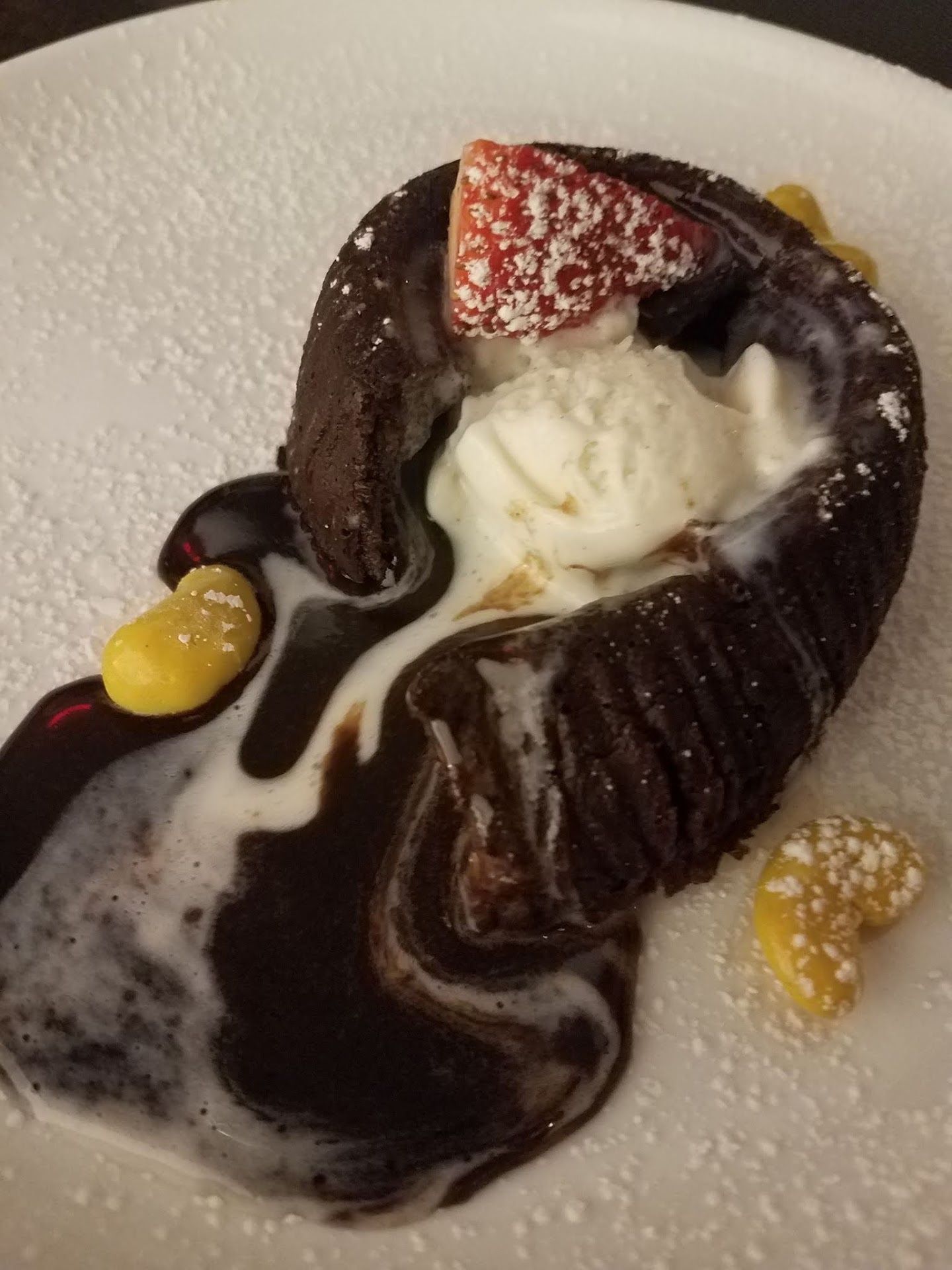 I ordered the short ribs. Large portion of meat atop mashed potatoes accompanied by sauteed root vegetables and garnished with some type of sprouts. The flavor was magnificent and the meat was not too fatty as can often occur with short ribs. My colleague ordered the Chicken pot pie. This dish came out and its preparation was finished table side. The server poured steaming gravy from a boat over the bowl and then added a large piece of puff pastry and then finished off the rest of the gravy over that. It looked amazing. Other guests ordered the Mussels, Wild caught sockeye salmon, Atlantic Char and Filet mignon. All the entrees looked outstanding and not one complaint was heard from this writer as we dined.