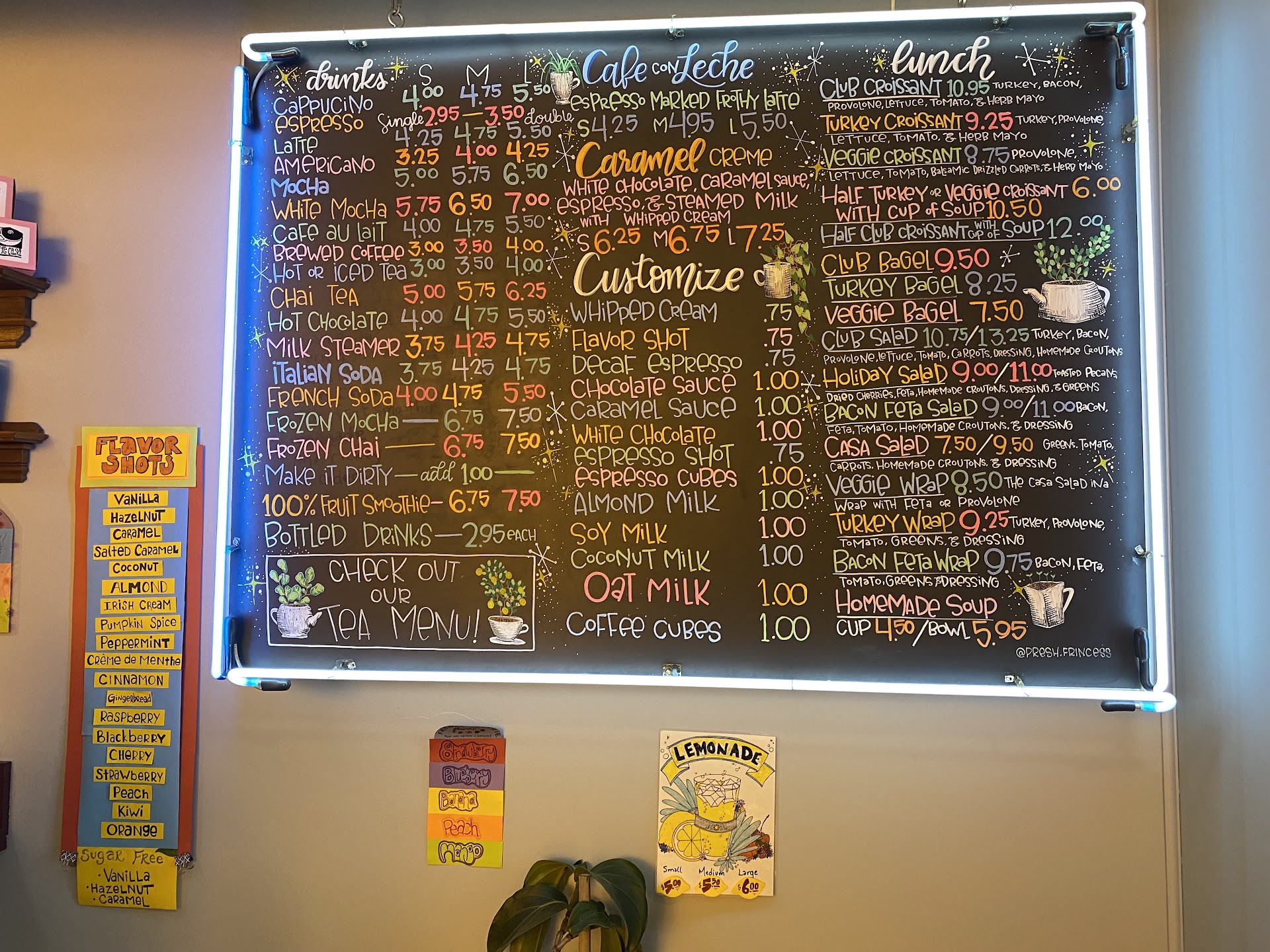 Food & Drink, 5/5: A shockingly inclusive menu! I have asked for their soup every visit, and am impressed by the vegan and vegetarian options. They cycle through a diverse selection and look forward to what I can try each time. I have a troubled appetite, but I've finished every meal! Each sandwich is made to order and a diverse selection is available on their menu. Separate, labeled steaming pitchers are used for non-dairies. They charge for every modification, including whipped cream, but offer coffee AND espresso ice cubes for your iced beverages! Non-dairies offered include almond milk, soy milk, coconut milk, and oat milk. A tea menu is also availably