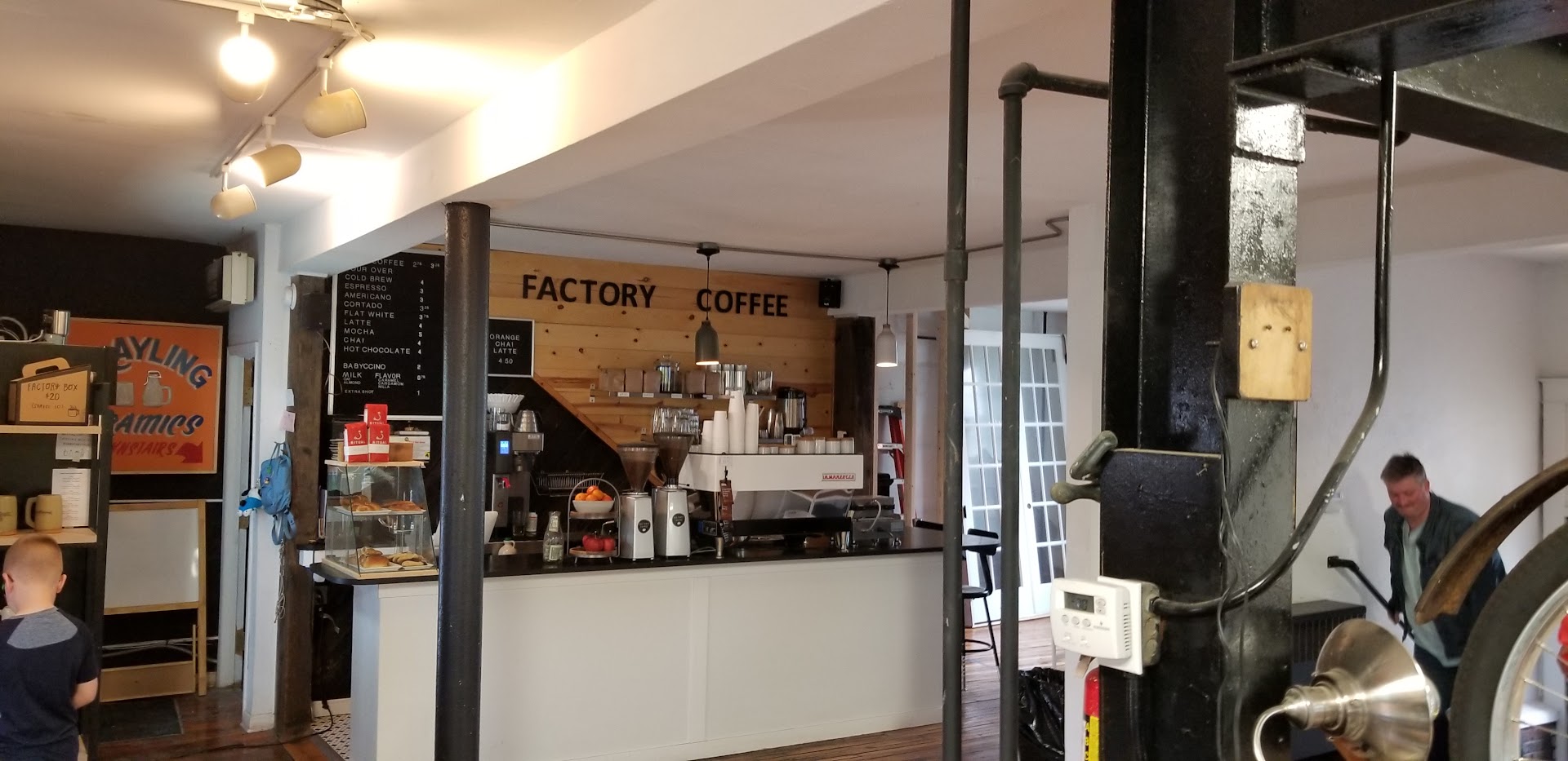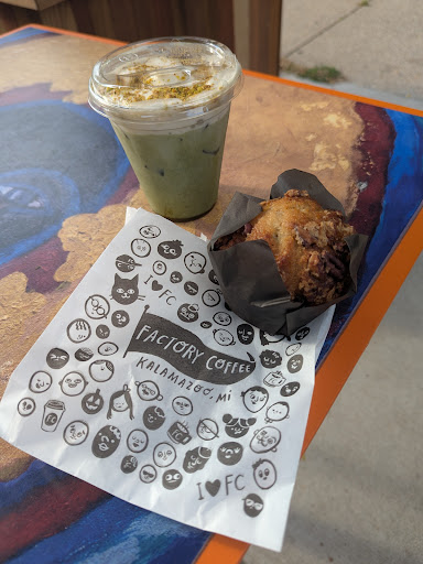 Read moreI liked this cafe. The theme was cool, and the building was pretty nice. The person at the counter was helpful. My date and I got a chai latte and a cortado. Both were good, and we enjoyed them. We unfortunately have not yet tried the food items, but they sound good. As I remember, they have some breakfast sandwiches, and danishes. The mugs that we used were made by a Kalamazoo ceramics company which I believe is in the basement of this building. In the coffee shop they have store merchandise, like pins, mugs, shirts, and more. They also have things made by the ceramics place. Conclusion: if you like coffee, breakfast, and small business, why...