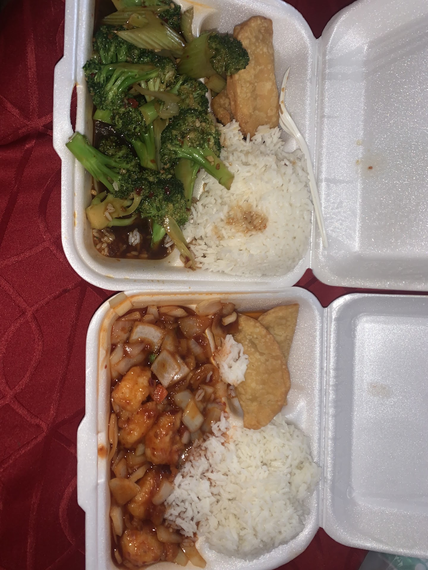 Read moreThe food was good but, very bad customer service. I called to place 4 simple orders. On the menu it said desserts were cheese cake and chocolate cake. I said I wanted 2 cheese cakes with a Dr Pepper. He screams in the phone "THIS IS A CHINESE RESTAURANT NO CHEESE CAKE OR DR PEPPER. WHAT DO YOU THINK THIS IS" And hung up on me. With being hungry and running late we called back and ordered again. I explained 5 times it's 4 separate orders and he kept saying okay. When it got to our hotel it was merged into one big bill and we were never told how much our individual order was so we all just had to guess and put in money that equaled up to $50. Our orders were all wrong and the egg drop soup was AWFUL....
