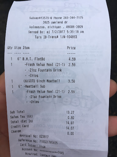 Read moresign on the showcase states a list of the only subs that u can get with coupon. Does not include the steak and cheese one i always get at other branch stores. when i asked why, "because it costs too much". note this is not about the numbered specialty subs that have never been part of the coupon deal. Another sign says they dont honor bogo coupons at all. This is the only place ive seen with these restrictions and exclusions and no apology. Lettuce was very wilted, must be another cost saving measure. will not go back to this store. what a...