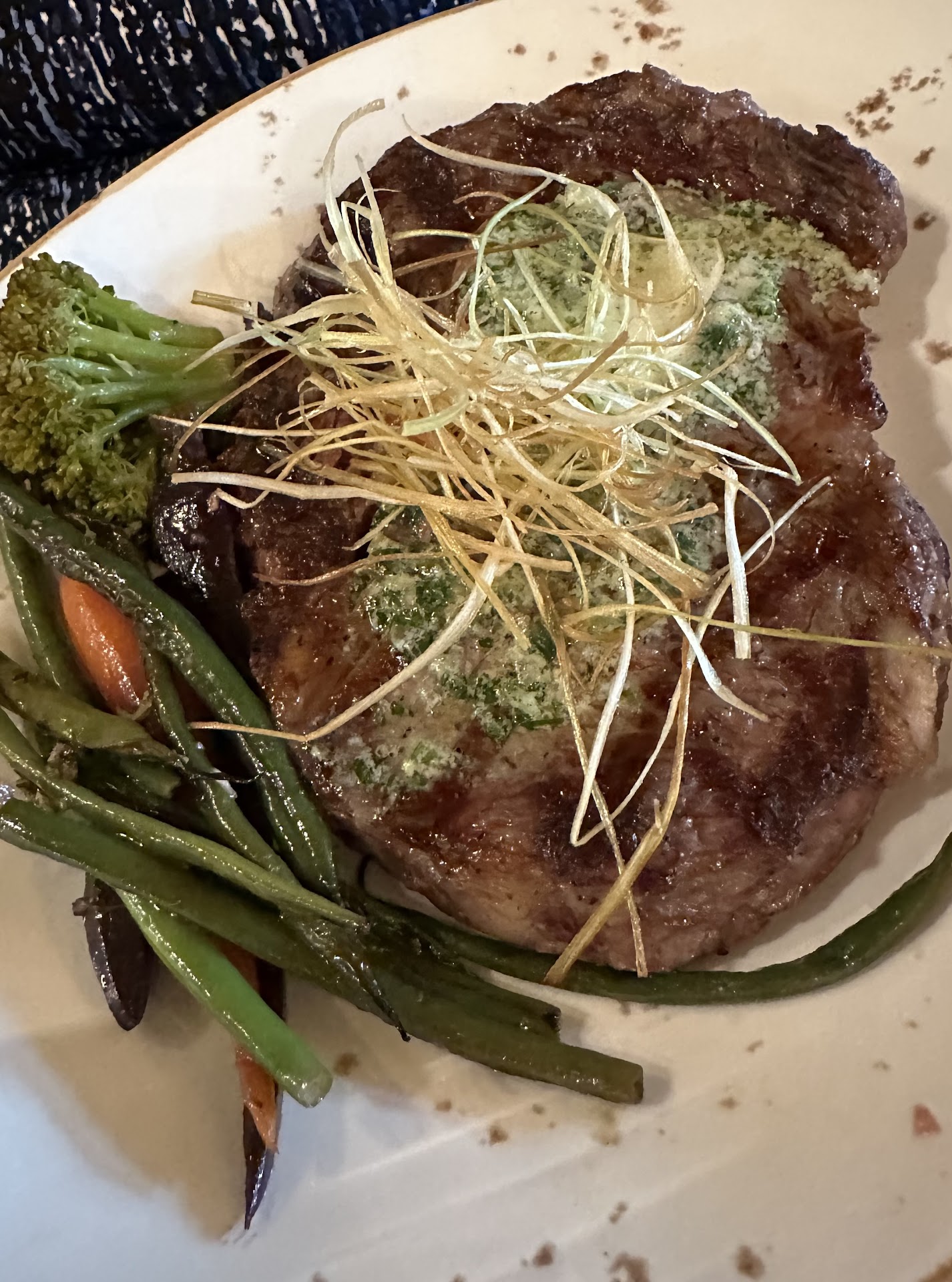 For my entree, I had the Cab Ribeye ($55.00) - 14 oz of beautifully cooked, juicy certified angus beef topped with bearnaise (+$3.00) with a side of seasonal veggie medley. Wonderfully marbled, each bite was rich and smooth like butter. It was a perfect combination of savory, meaty notes and a slightly sweet undertone. Furthermore, the crust was magnificently seared to caramelized perfection. Damn, this was one good piece of meat. Many, many compliments to the chef. It was one of the best steaks I have ever had.