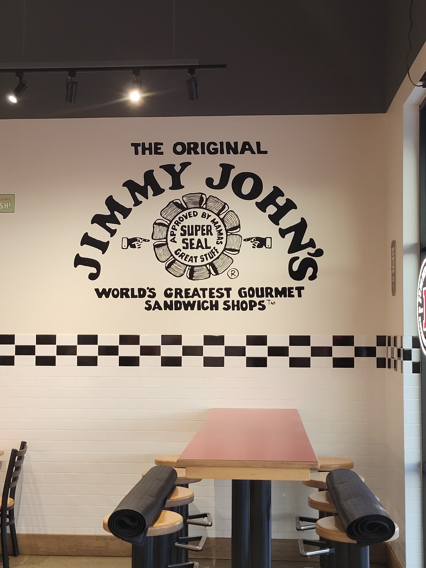 Wanting pizza but the wait was out the door so we went to Jimmy John's. Not familiar with how things go we were rushed through the process. Husband ordered #4 turkey and cheese, when he was asked about his choice of bread we chose wheat. I ordered #11 country club on wheat. When the order was ready imagine our surprise .. sandwiches not a sub! Don't get me wrong the SANDWICH was good and made fresh. Buyer be ware ... wheat is a sandwich. Yes, there is a board that describes everything but again, not our regular restaurant and the young man taking the order surely knew that (because we told him). Oh .. instead of taking a name or giving us a number when your sandwich is made, they just yell out the number of the sandwiches you're supposed to come up and get it well. There is no sound deafening boards or anything, the workers end up competing with everyone talking and can barely hear what they're...