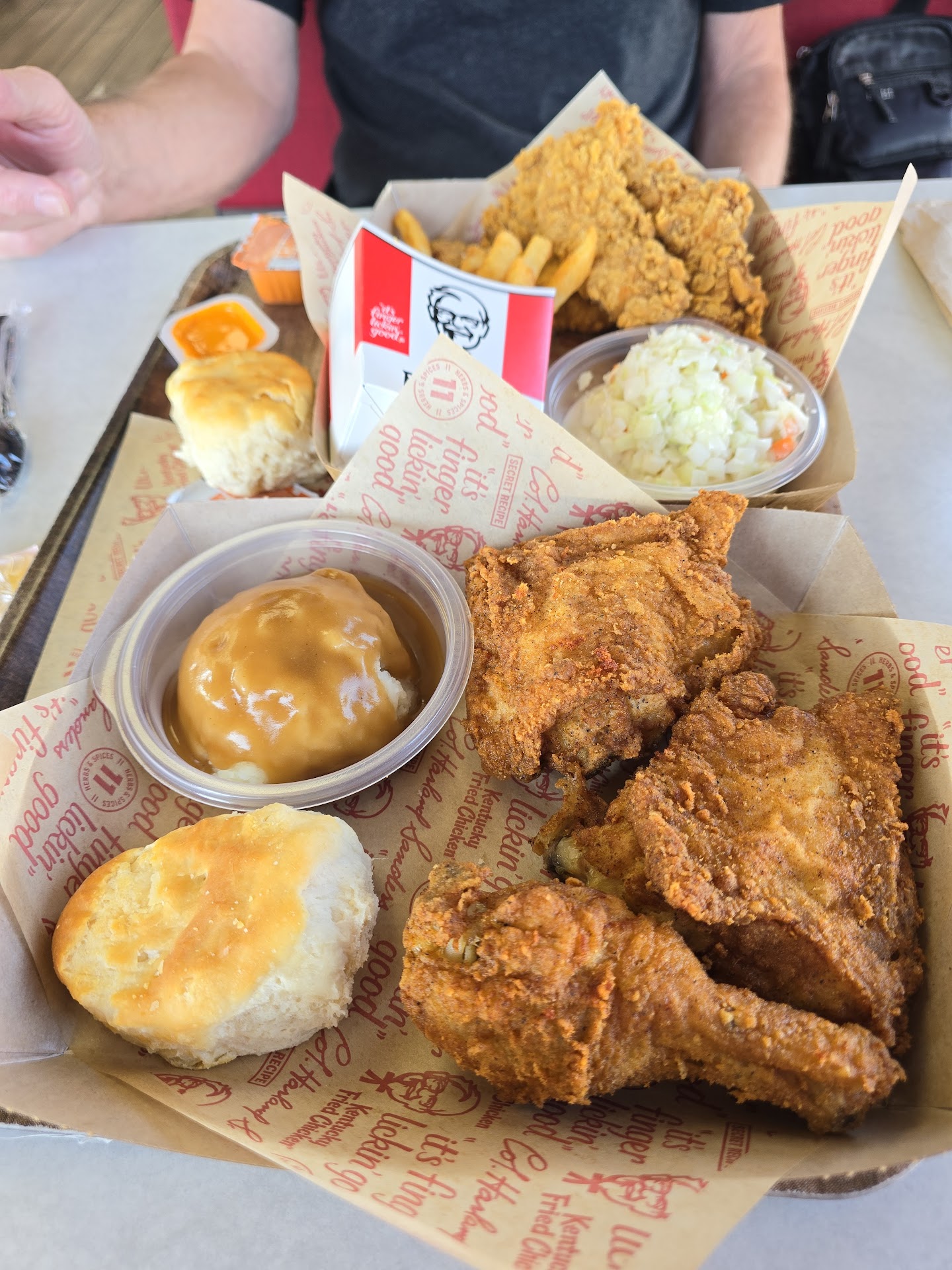 I only have one complaint. If I order a meal deal that comes with a half dozen biscuits, I feel like butter, and honey should be something that comes with the meal. And, although I personally prefer 2 packets of each condiment per biscuit, I feel as if each biscuit should come with at least one of both condiments. It's like ordering mashed potatoes and not getting the gravy. Or nachos and not getting the cheese. I mean its "buttery flavored" spread and a "honey like" sauce product. I just spent $77 on some chicken, a couple of biscuits, and 3/4 of a cup of instant mashed potatoes. I'd be willing to bet a nice chunk of change that tossing a couple of 1/3 full packets of faux sauce like condiment products in with the half rack of biscuits I just paid way too much for and are inevitably going to be as dry as the sand in the desert and virtually inedible before I get to them, probably isn't going to send the company, an american institution, into some kind of downward financial spiral plummeting it's stock and net worth nose first into a fire blazen explosion of certain death, forcing the Colonel to close it's doors permanently, and seek out new means of employment at some other lame overpriced fast food competitors location just to make ends meet. Hey Saunders, just throw in some butter and honey with your once superior, but as of late, mediocre at best bone dry excuse you call a biscuit and we will keep coming back for your extremely overpriced and slightly less than average cholesterol bombs you call food. Sound...