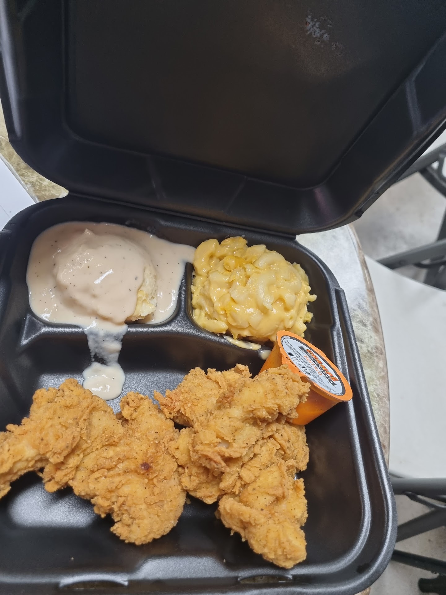 Chicken is sitting in a display case and was cooked who knows how long ago. Like warm. Not juicy. Breading had that solidified oil taste that chicken under a heat lamp has. Not only that but 3 strips and 2 sides with no drink was 10 bucks!!!