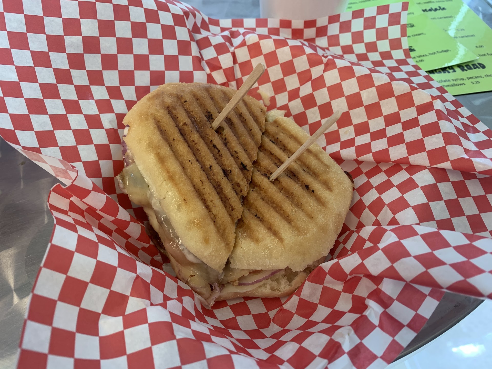 Read moreWe stopped in for lunch on our way through town. We both ordered the Kanab Classic, which (copying from the menu) consisted of roasted chicken, tomato, red onion, bacon, ranch, and provolone on a ciabatta roll. It was absolutely delicious! Afterward h husband talked me into an ice cream sundae; I ordered some kind of mint sundae (loaded with brownie bits, Andes mints, and hot fudge), while my husband ordered a sundae with salted caramel chips, Heath crunchies , and pecans. They were loaded! Definitely had a sugar rush after that! Loved the spoons which changed color when they were cold đ Everything was good. Itâs inside the cute local drug store, with minimal seating inside, and lots of patio seating. I...