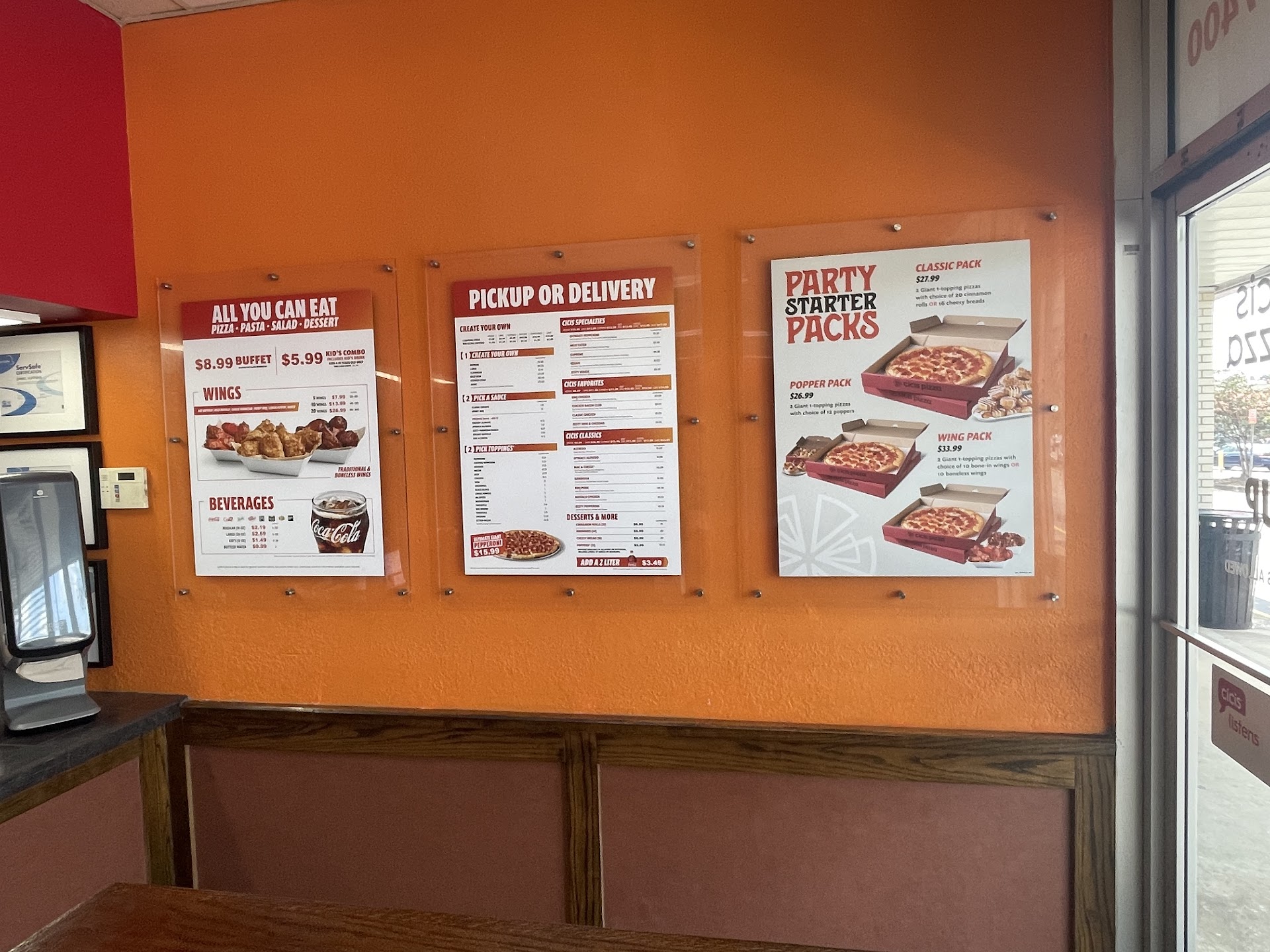 Read moreMy fiance and I went to eat here and it was terrible. We ordered a pizza special made and 10 wings. It took the girl 3 times to get the order right at the desk. We finally repeated it one word at a time to place the order There was no clean tables in the restaurant. We took wipes and cleaned the table. It was nasty. We looked around and no one was busing or cleaning tables When getting our pizza, we only got 1/2 of a pizza not a whole pizza. We ordered a large and only got 6 very small slices. Not much sauce on the pizza at all. I tried another slice of a different pizza from the buffet. It was awful. Plus it was cold. When getting our wings, we again were very dissatisfied. The wings looked like wings from a dove or quail. It sure wasn't chicken. So tough, you couldn't eat it. It was nowhere worth what we paid for our meal. We were not able to see a manager, so we just left. So from this secret shopper, they get a very very poor rating. Corporate will be contacted about this. If I were you I would not waste my money at...