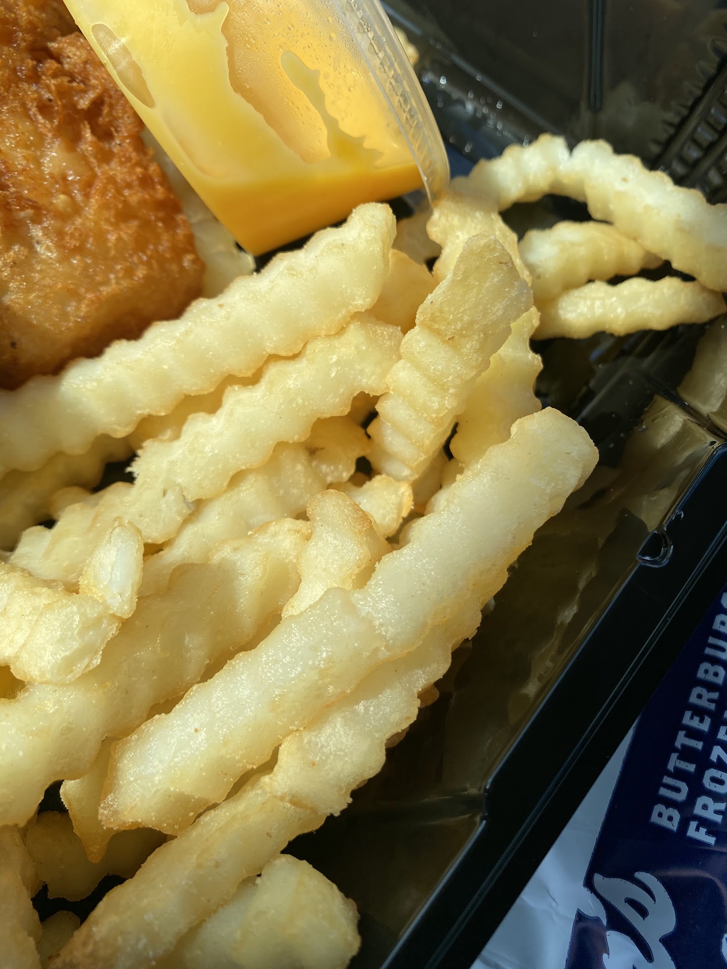 No We are sorry. Nothing. Lowering my review to a one... Last visit for us. UPDATE2: 11:15am $33.00 Meal. Ordered Chicken sandwich and 4 piece Cod dinner. Chicken okay. Fish was over cooked externally and very greasy tasting. When touched or cut the coating fell off revealing under cooked fish. I also got one small 1/2 full package of fries. Used to fill the empty space with fries. :-(
