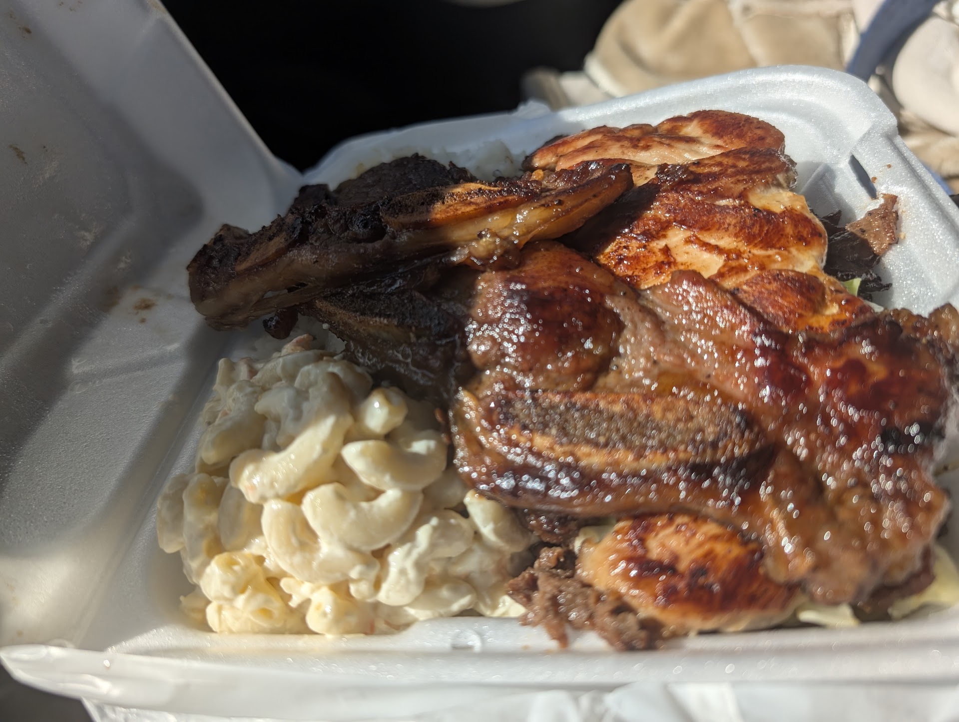 The rice is perfectly made, and the macaroni salad is nothing you've had before. Take a little salad, a little rice. And let it go to work for you. It'll send you over.