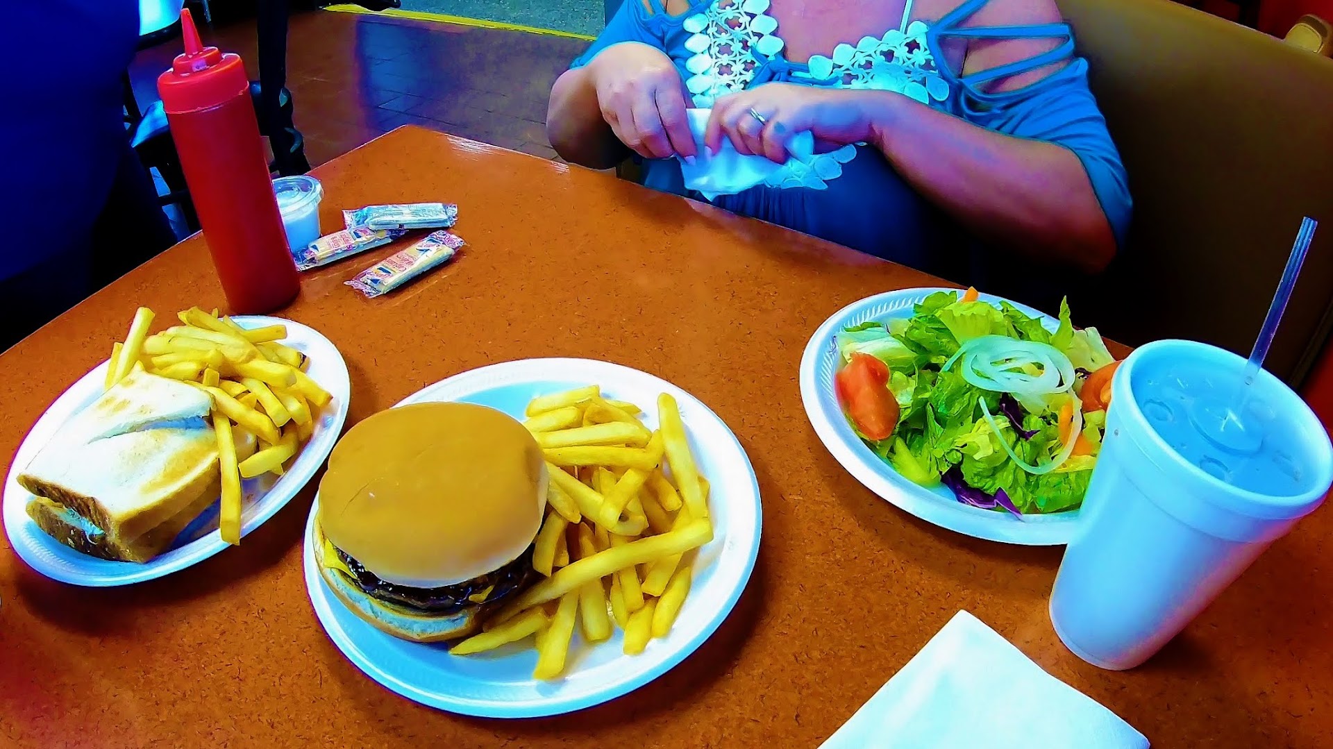 3.5 star rating. We stopped in for dinner after getting off work late. You place your order at the counter then they will bring your drinks and food to your table. The staff here is very friendly and they do come around and check on you during your meal. We ordered a Greek gyro and a chicken tips plate with slaw and green beans. Dining area was about 75% filled but service was relatively fast and food came out hot on paper plates with plastic utensils. The gyro was packed full with sliced gyro meat, lettuce and onions, and what was supposed to be tzatziki sauce but it was more like a watery salad dressing that didn't really taste like tzatziki. The gyro meat was tasty but very dry, like it has been sliced and left out under a heat lamp for a while. This was all wrapped up in a soft, fresh and hot pita. Truthful, the pita was the best part of it all. The chicken tips plate had grilled chicken bites over white rice with chicken gravy and was ordered with green beans and white slaw, and came with a dinner roll. The chicken was a bit over cooked and dry on the outside, so it's was good to have the generous about of gravy over it all. The green beans were straight out of the can with no seasoning whatsoever. The slaw was very tasty though, and had we known, probably would have gotten double slaw instead of the green beans. Overall, not a bad experience, but this won't be one of our regular stops for dinner. Maybe we'll try a burger at...