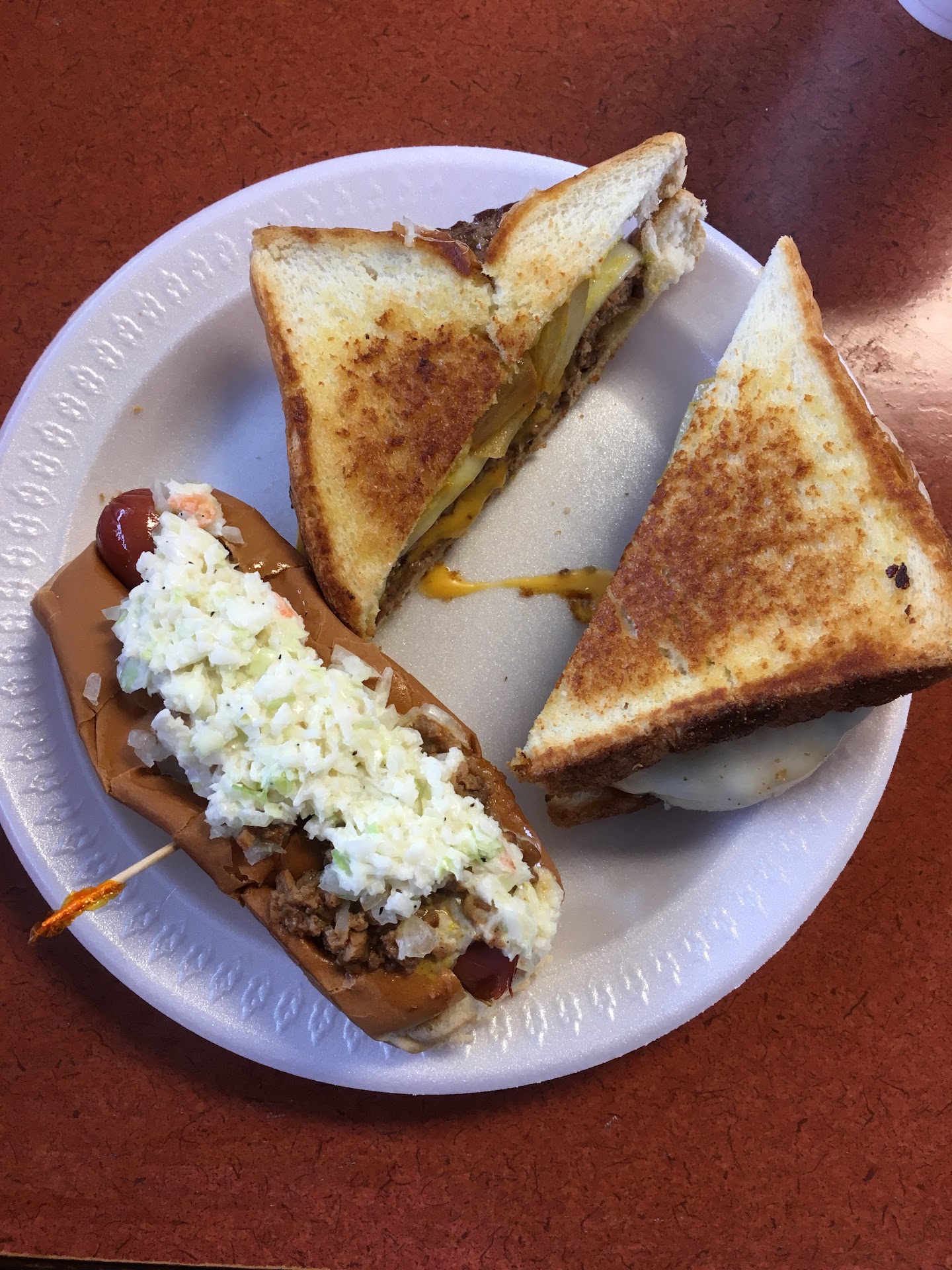 You order at the counter and they bring it to you, and I settled on the patty melt, a hotdog, and fries.