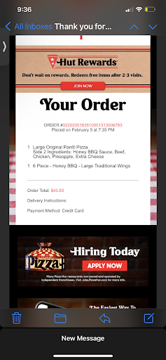 Ā Ā Ā Read moreI love Pizza Hut. We order several times a month. But last night I got an email order confirmation for several pizzas, wings, garlic bread, a party full of items but it was in North Carolina and I live in California! It was too late to stop the order when I logged into my account, I'd been hacked and they used all my Hut Rewards! I was given the # to get my rewards back but that's not enough. The manager should have gotten on the phone with me and apologized for filling an order not on my account. I realize with their system they have no way of knowing the account origin and who's ordering, that is where they need to take action. They need to formulate an algorithm that can check the account holders location and the location of the delivery. An email isn't going to cut it. I don't sit on my emails but I do answer when I get a text message. It would cost nothing to send a notification like Google or Yahoo do when someone is trying to access your account. A quick, "Hey, its Pizza Hut, did you order pizza in NC? Just checking because we want to make sure this is your order using your Hut Rewards.". Something to that effect... I can do nothing but get my points back, I hope, but we need to address how they got my account and my password. I leave this rating with a heavy heart because as I said we in our household love Pizza Hut. Best pan pizza hands down but situations like this shouldn't happen and Pizza Hut may actually do something if a 1 star...