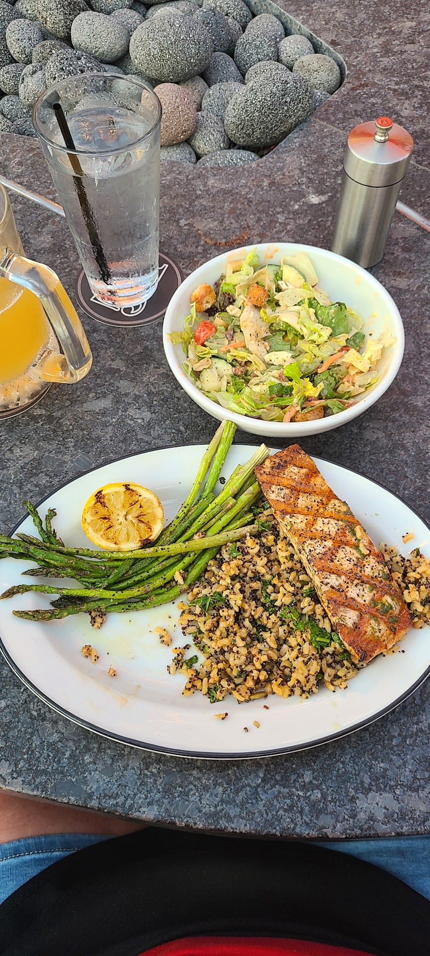 Read moreOur experience was amazing! It was our first time at this restaurant and we immediately loved the vibe. We chose to sit outside and were glad we did. The weather was perfect, and once we were outside we noticed that there was Bocci Ball, a pickle ball court, Cornhole bag game, and there were 2 Tiki Toss Ring games. Inside the restaurant we found that they also have 2 golf simulator bays with bar stool seating so you can play and eat/drink while using the bay. I chose the grilled salmon. It came with ancient grains rice blend, a house salad and another side. I chose grilled asparagus. When my entree arrived it also had a grilled lemon as garnish. Without a doubt it was one of the best meals I've had, especially for grilled salmon! My husband ordered the fried shrimp (Lieutenant Dan's Platter) with house salad and steamed veggies. My son ordered the grilled chicken Caesar salad. Both were amazing as well. The chicken salad in particular was so big that my 26 year old son couldn't eat it all. We've already decided that we're coming back to eat here before we leave KC and head back home to Western Iowa!