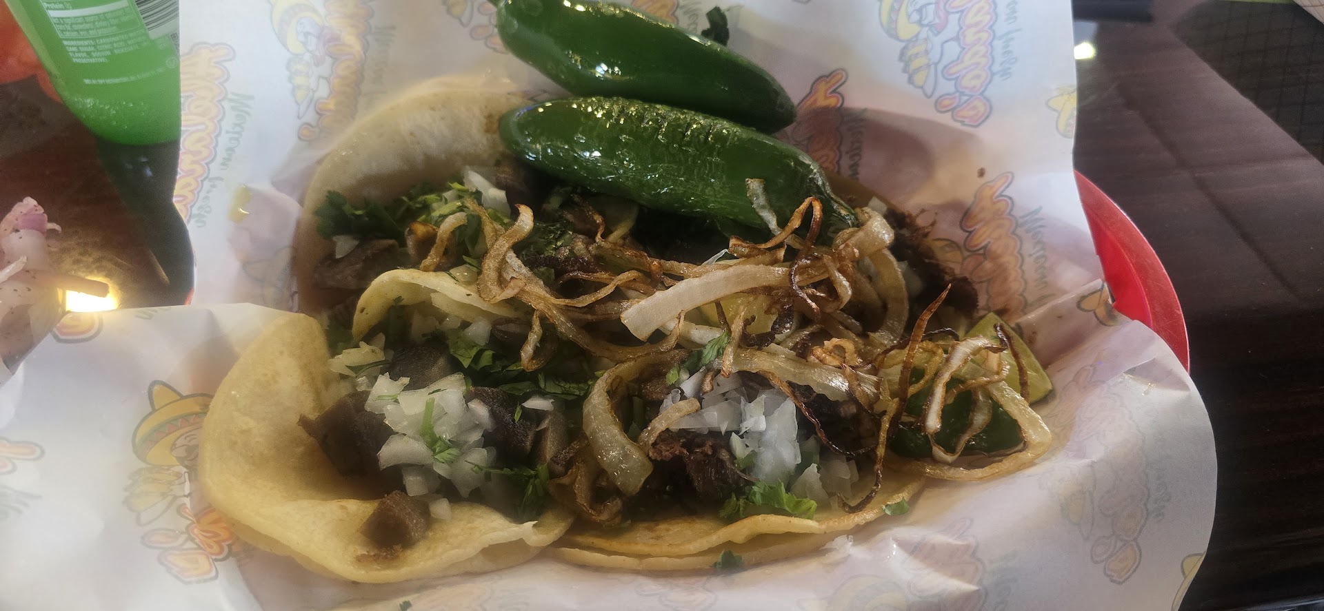 The Diablo burrito though, ill give 5 stars, I really enjoyed it, the asada was delicious, whatever sauce was on it was great, but it wasnt really spicy at all, which is so weird when its the Diablo burrito... the cowboy fries were much spicier having jalapeno on top, so was their red and green sauce packets they include very spicy, 3stars on the sauce packets tho didnt care for em. Dont seem to be house made. Sealed plastic packets.