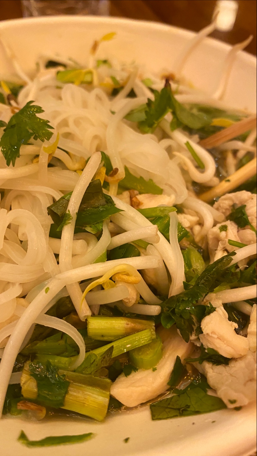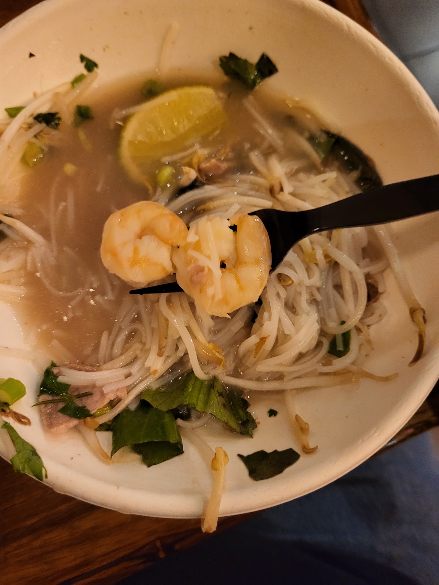 🍤 and mini egg roll smaller than any I've had at a pho restaurant in the 🇺🇸, 🇨🇦, 🇪🇺 , 🇨🇳. The beef in the salad was cooked a few days ago. Fresh veg ! All severed in authentic paper 🥣.