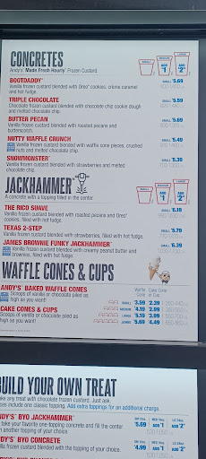 Read moreCome on Andy's, you are better than this. I have stopped here many times and love the custard and usually great help. Not this time. At the window the young lady assisting me handed me a cherry bash concrete that was way too full. When I explained I needed a lid as I had a 20 minute drive, she handed me a flat lid. There was no way that lid was fitting on the cup which was overfilled. I asked if she had a domed lid or another option so it didn't spill. "That's the only lid we have." was the answer given. And no other help was offered, so I tried to make it home with the open custard and way before I could get there it had melted and overflowed the cup and covered my console, passenger seat and carpet in cherry custard. So I stopped and dumped it out the window. Thanks Andy's! Now I get to clean custard out of my car before it smells like rotten milk. Normally have nothing but positives to say about Andy's, but surely you can do...