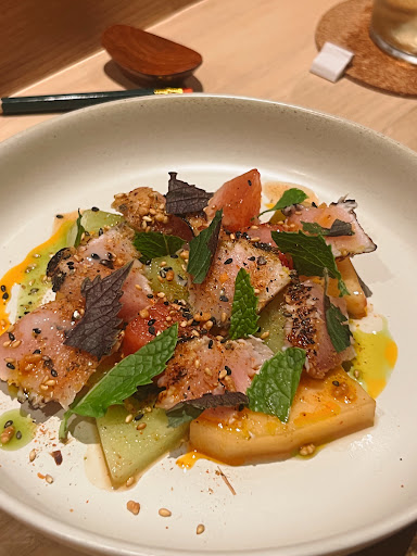 Between our group, we tried almost the whole menu. Here’s how I’d rank my favorites: Hamachi with melon – fresh, clean, and perfectly balanced. Cabbage salad – unique with crispy sardines and little caramelized sugar pieces that made it stand out. Eel – simple but full of flavor, clearly made with care. Eggplant with snap peas and peppers – really flavorful and well-prepared. Shrimp & vegetable tempura – fun and different, still tasted light for being fried. Tomato salad – fresh and tasty, though more straightforward compared to the rest.