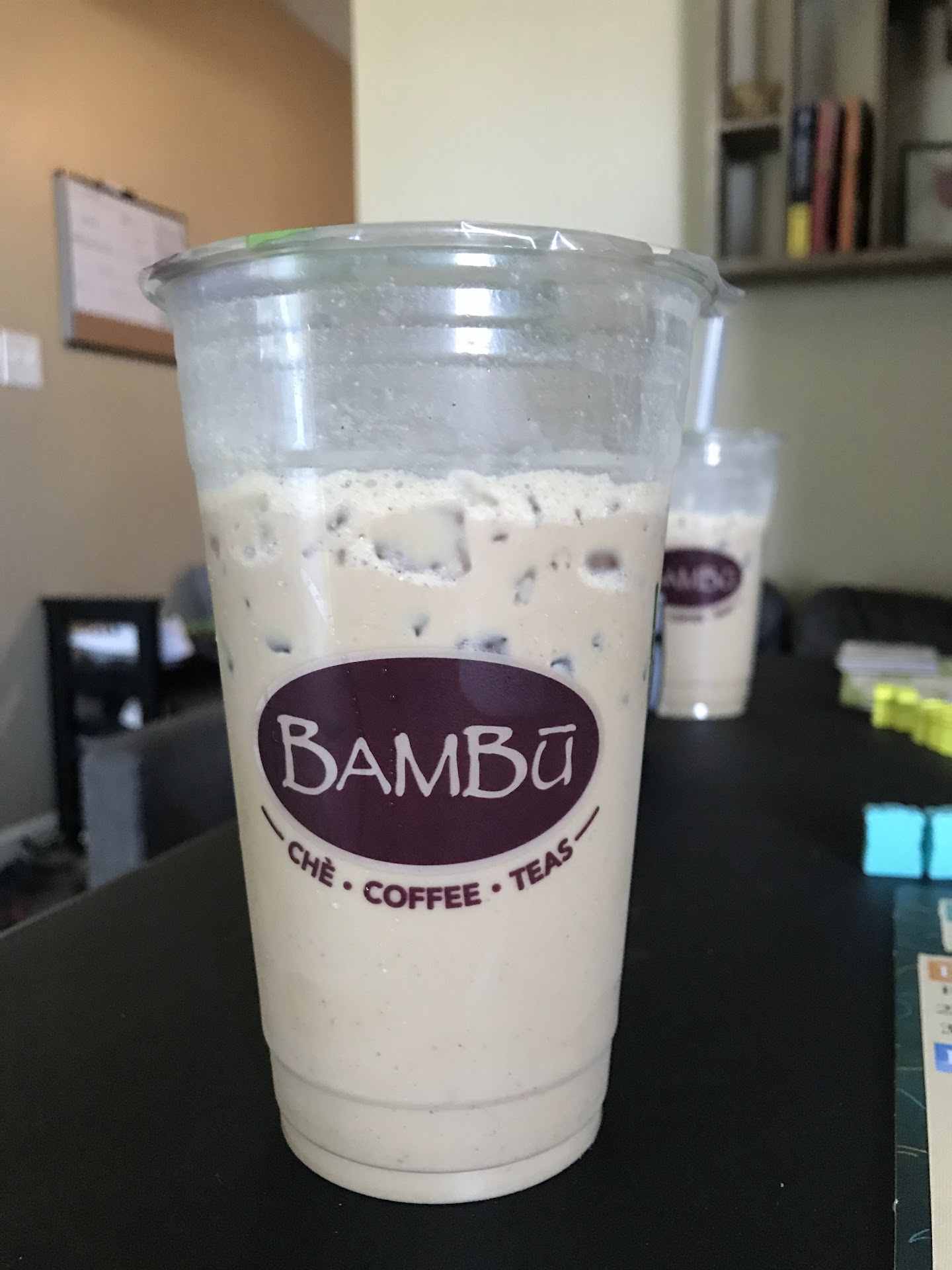 Read moreIn the last 3 days, I have gone to Bambu Desserts & Drinks and each day have been served with HIGH QUALITY items and AMAZING customer service. I've order the Salted Caramel Frape (perfectly blended, strong coffee used - no chunks of ice, percentage of sweetness is able to be shared with the staff when ordering), Salted Caramel Iced Coffee (strong coffee used, amount of ice is able to be shared with staff according to your preference, percentage of sweetness able to be shared with staff when ordering - delicious), Hazelnut Mocha hot (strong coffee, smooth NOT gritty, perfect sweetness - I ended up ordering 2 of these during one trip because it was so good), Strawberry Fruit Smoothie (perfectly blended, no chunks of ice, delicious, perfect sweetness), Mango Fruit Smoothie (perfectly blended, no chunks of ice, delicious, perfect sweetness), Taro Lover (my friend substituted the coconut milk with regular milk) she loved it and went back to Bambu the next day for more and took her family with her:). In addition to this, I am ADDICTED to the chocolate chip cookies sold here! This establishment is clean and offers a lot of seating. Parking is available behind the facility. I highly encourage this business! The only thing I didn't like are the jellies that are in some of the drinks - but I am American, so it is just because I am not sued to these and didn't like them. I am sure if I asked, that the staff at this business would make my drinks without the jellies. Overall - I highly recommend this business - I am heading there right after I finish submitting this review 😊! THE ONLY THING I WILL RECOMMEND is that the large sized hot beverages are way too small (see picture)...the cold/iced drinks are large but the hot beverages are more of a...