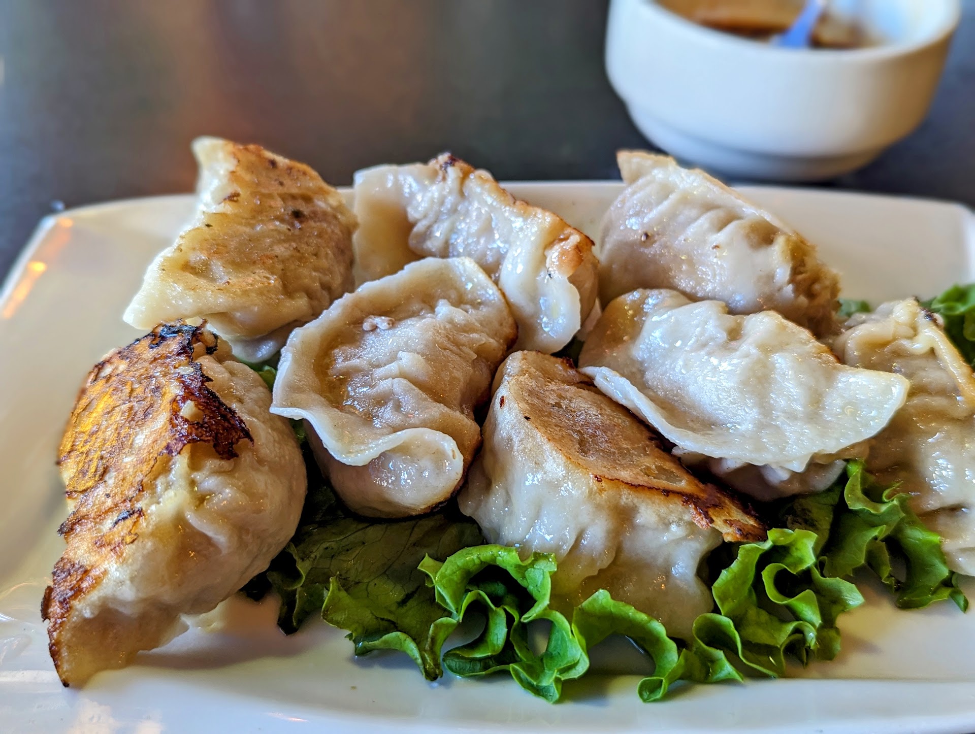 Next came the potstickers, notably large, far exceeding the size of those you'd find in the frozen section of a store. I needed to cut each one in half, and that half was a mouthful when drenched with the included sauce. There were eight on the plate, and I devoured them.