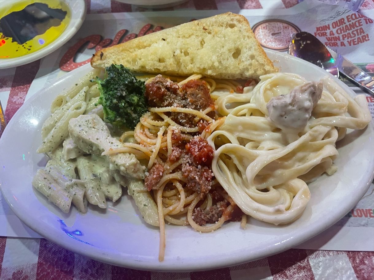 From the moment you enter Buca di Beppo, it’s like walking into your Italian grandma’s basement if your grandma was a hoarder, had questionable taste in Catholic memorabilia, and believed every family photo ever taken should be framed and nailed to a red checkered wall like an exorcism in progress. I mean it. This place has more pictures than your aunt’s Facebook timeline and smells like garlic made sweet love to a meatball in a wine cellar. It’s beautiful. It’s chaos. It’s carbs. It’s home. The vibe is “mobster’s retirement party meets Olive Garden on acid.” It’s loud in there. Not like "rowdy crowd" loud. No. This is “we’re hosting a wedding, baptism, divorce hearing, and a mafia confession all at once” loud. Every table sounds like it’s being mic’d for a documentary on family trauma. It’s like eating inside a Sopranos blooper reel and I loved every second of it. The Food Let’s talk about the real reason we’re here: the food. Mama mia. These portions aren’t “family style” they’re “extended bloodline style.” One bowl of spaghetti could feed a Little League team and have enough left over to carb load the coach. They bring you dishes the size of satellite dishes. I ordered the Spaghetti and nearly had to sign a waiver. The thing came out looking like it had its own zip code. And the garlic bread? Oh sweet carbohydrates of Nazareth, the garlic bread is baptized in butter like it just gave its life to the flavor gospel. One bite and I started speaking fluent Sicilian or at least loudly mispronouncing it like I was auditioning for Goodfellas: The Musical. Meatballs: I asked how many meatballs came with the spaghetti. The waiter said, “Just one.” I laughed. He didn't. It arrived. ONE MEATBALL. The size of a softball. This wasn’t a meatball—it was a meat planet. I named it Tony. Tony the meatball. He had density. Personality. He paid taxes. Shout out to our server, who handled our table like a culinary therapist with a tray. She knew the menu, cracked jokes, and never once judged us for ordering a dessert “for the table” that mysteriously never left my end of the table. It seems weird I talk about restrooms but it's important as well. I went to the bathroom and somehow had to walk through what looked like the kitchen, a photo gallery of 1950s Italians, and a possible Vatican satellite office. At one point I think I entered a portal. When I came back, I felt emotionally closer to Dean Martin and Frank Sinatra Final Thoughts: Buca di Beppo is not just a restaurant. It’s an experience. It’s a sensory avalanche, a carbohydrate crusade, a place where diet plans go to die and your pants beg for mercy. It’s loud. It’s nostalgic. It’s like going to your cousin Vinny’s wedding even though no one’s getting married and you’re just here for the baked ziti. Would I return? Absolutely. Like a boomerang made of mozzarella. This is where flavor and dysfunction hold hands, sing “That’s Amore,” and throw marinara...