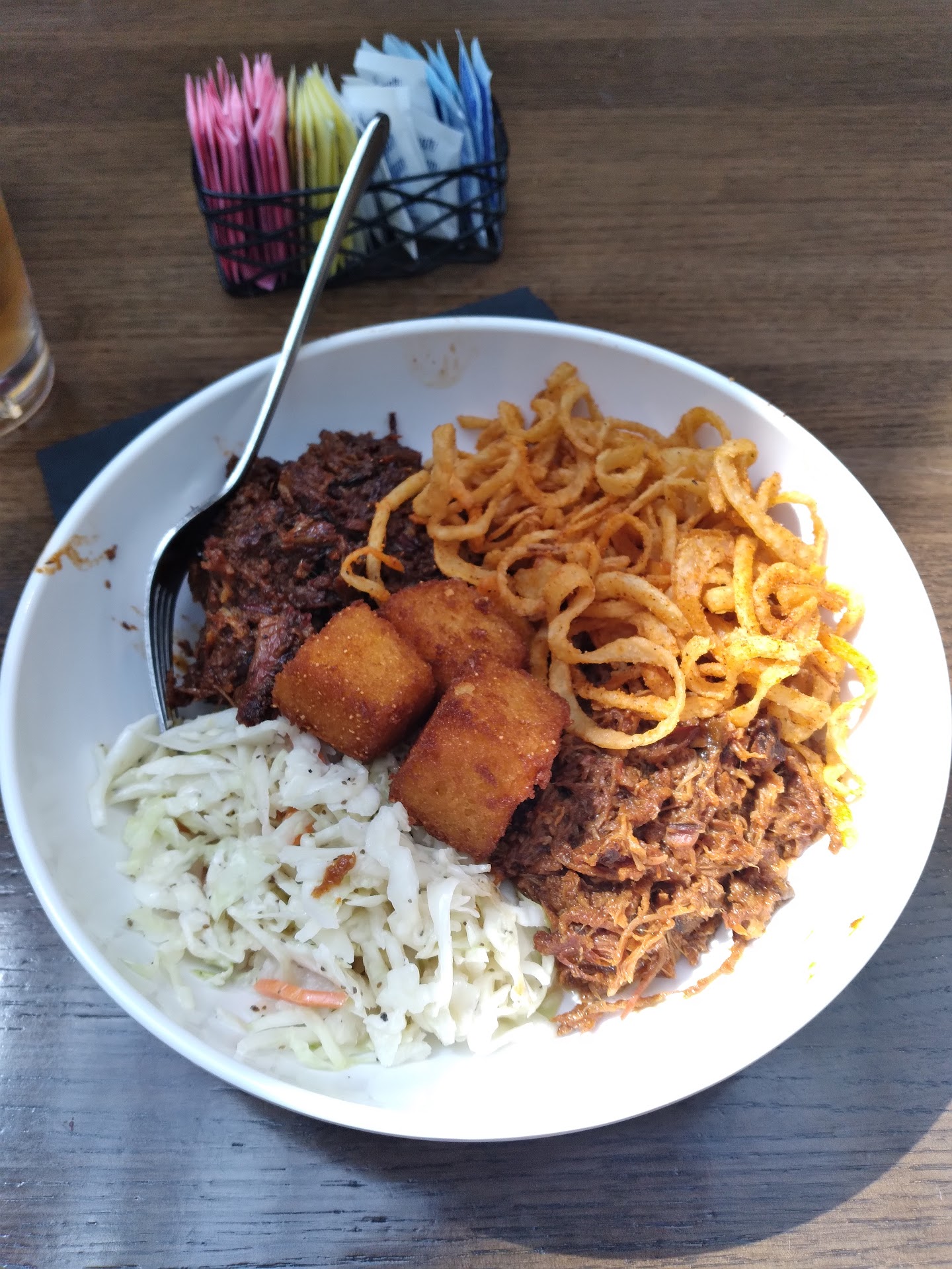 Likes - the food tasted great! The portions were big. The prices were very reasonable, actually on the low side. Dislikes - the service was SO BAD!! Our waitress refilled all the drinks for the MEN in our party, before their cups were empty. EVERY FEMALE in our party went dry & even had to finally ask for refills. She brought my tea back only 2/3 full but gave the man next to me a full to the rim glass of the exact same tea. When I asked if they were out of tea, she said no. So I asked if I could get my glass filled to the top as well (because it took so long to get this refill & I wanted to spare myself having to chase her down again), she said that my glass was full & she walled away... she never came back to fill glasses of any of us women but continued to keep the men's glasses refilled before they were empty. Stupid choice on her part because we women were the ones paying each of our tickets... even though she brought all the tickets to the men even though women asked for the tickets. This kind of service must be why this place was practically empty on a busy Saturday afternoon when the other restaurants in the mall had lines going out the door... Atmosphere was modern industrial. And while that looks cool, it made it impossible to talk to anyone other than the person sitting right next to you. High ceilings & no soft surfaces to absorb sound meant that When we tried to talk to the person sitting directly across the table, we had to yell. Forget about talking to anyone else down the table. I finally sat in silence & are my meal without much to drink. Between the horrendous service & the inability to actually socialize at the meal, I suggest doing the carry out & eat at home option because the food was delicious & prices are great. Just rating food & price, it's a 5 ⭐ ... even with the lack of ability to talk to the whole table, I'd still give it a 3 ⭐... but that waitress killed the whole experience & honestly almost got this a 1 ⭐ ... I think I'd rather just go to Arthur Bryant's instead of dealing with parking, walking & then getting 💩 service while not being able to carry conversation 😒 the food wasn't worth all that. Carry...