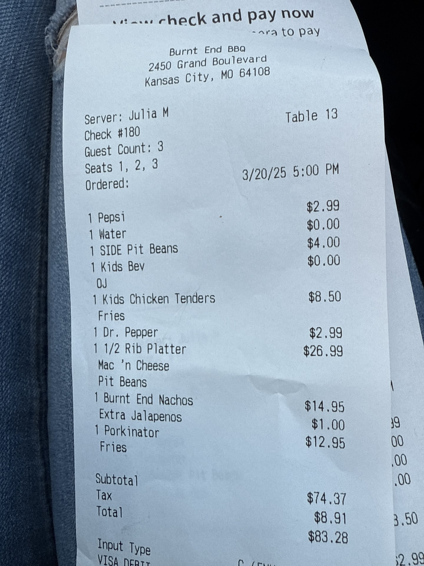 Likes - the food tasted great! The portions were big. The prices were very reasonable, actually on the low side. Dislikes - the service was SO BAD!! Our waitress refilled all the drinks for the MEN in our party, before their cups were empty. EVERY FEMALE in our party went dry & even had to finally ask for refills. She brought my tea back only 2/3 full but gave the man next to me a full to the rim glass of the exact same tea. When I asked if they were out of tea, she said no. So I asked if I could get my glass filled to the top as well (because it took so long to get this refill & I wanted to spare myself having to chase her down again), she said that my glass was full & she walled away... she never came back to fill glasses of any of us women but continued to keep the men's glasses refilled before they were empty. Stupid choice on her part because we women were the ones paying each of our tickets... even though she brought all the tickets to the men even though women asked for the tickets. This kind of service must be why this place was practically empty on a busy Saturday afternoon when the other restaurants in the mall had lines going out the door... Atmosphere was modern industrial. And while that looks cool, it made it impossible to talk to anyone other than the person sitting right next to you. High ceilings & no soft surfaces to absorb sound meant that When we tried to talk to the person sitting directly across the table, we had to yell. Forget about talking to anyone else down the table. I finally sat in silence & are my meal without much to drink. Between the horrendous service & the inability to actually socialize at the meal, I suggest doing the carry out & eat at home option because the food was delicious & prices are great. Just rating food & price, it's a 5 ā ... even with the lack of ability to talk to the whole table, I'd still give it a 3 ā... but that waitress killed the whole experience & honestly almost got this a 1 ā ... I think I'd rather just go to Arthur Bryant's instead of dealing with parking, walking & then getting š© service while not being able to carry conversation š the food wasn't worth all that. Carry...