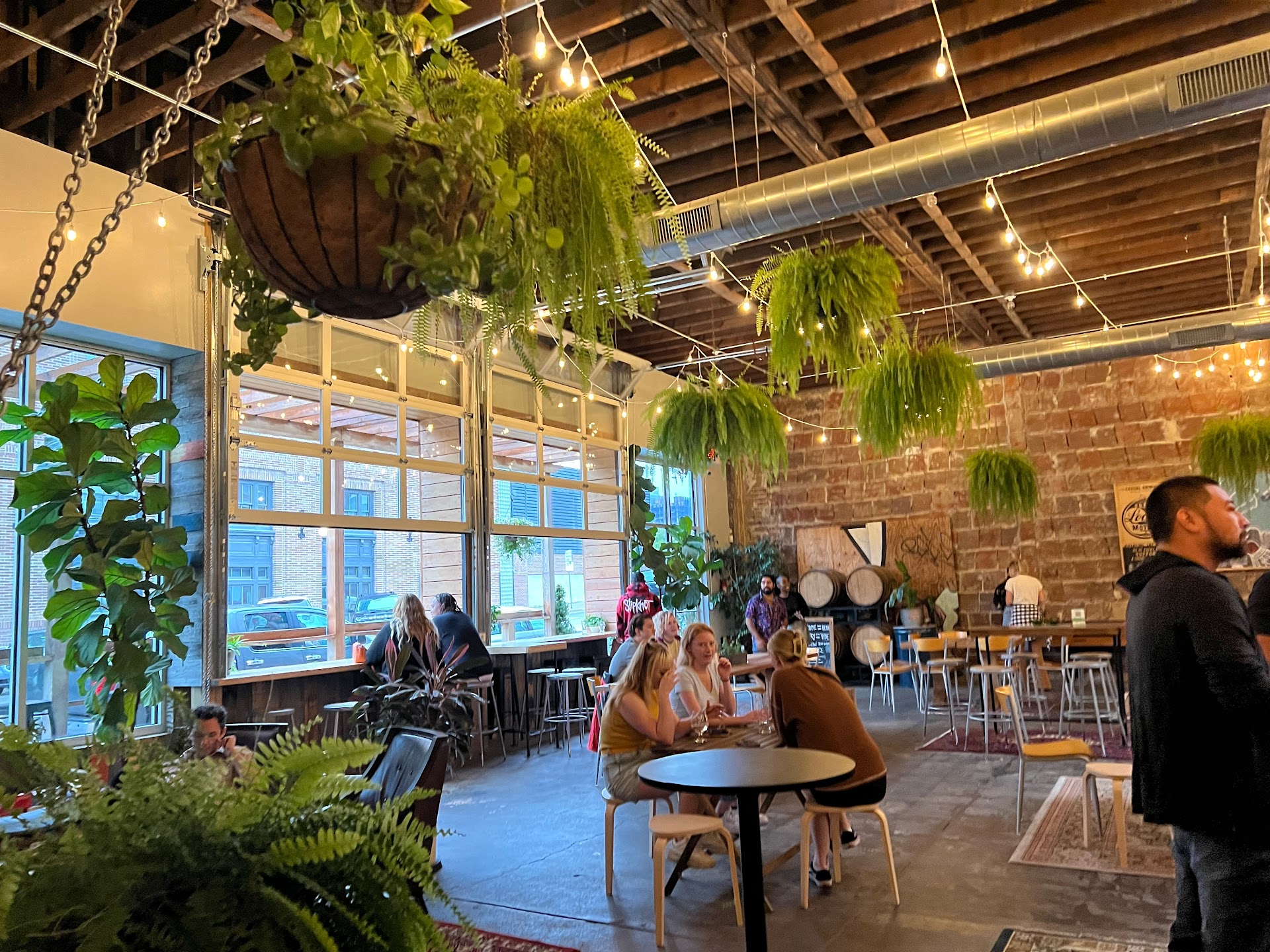 The interior design is nothing short of lush. The high warehouse rafters are not just a testament to the building's origins, but they're masterfully utilized to create a sense of grandeur, with light pouring in from above, illuminating a verdant canopy of extensive plants. It's an incredible visual, creating a natural, almost serene backdrop for enjoying some truly fantastic brews. The combination of industrial chic, botanical beauty, and abundant natural light makes for an incredibly comfortable and aesthetically pleasing environment.