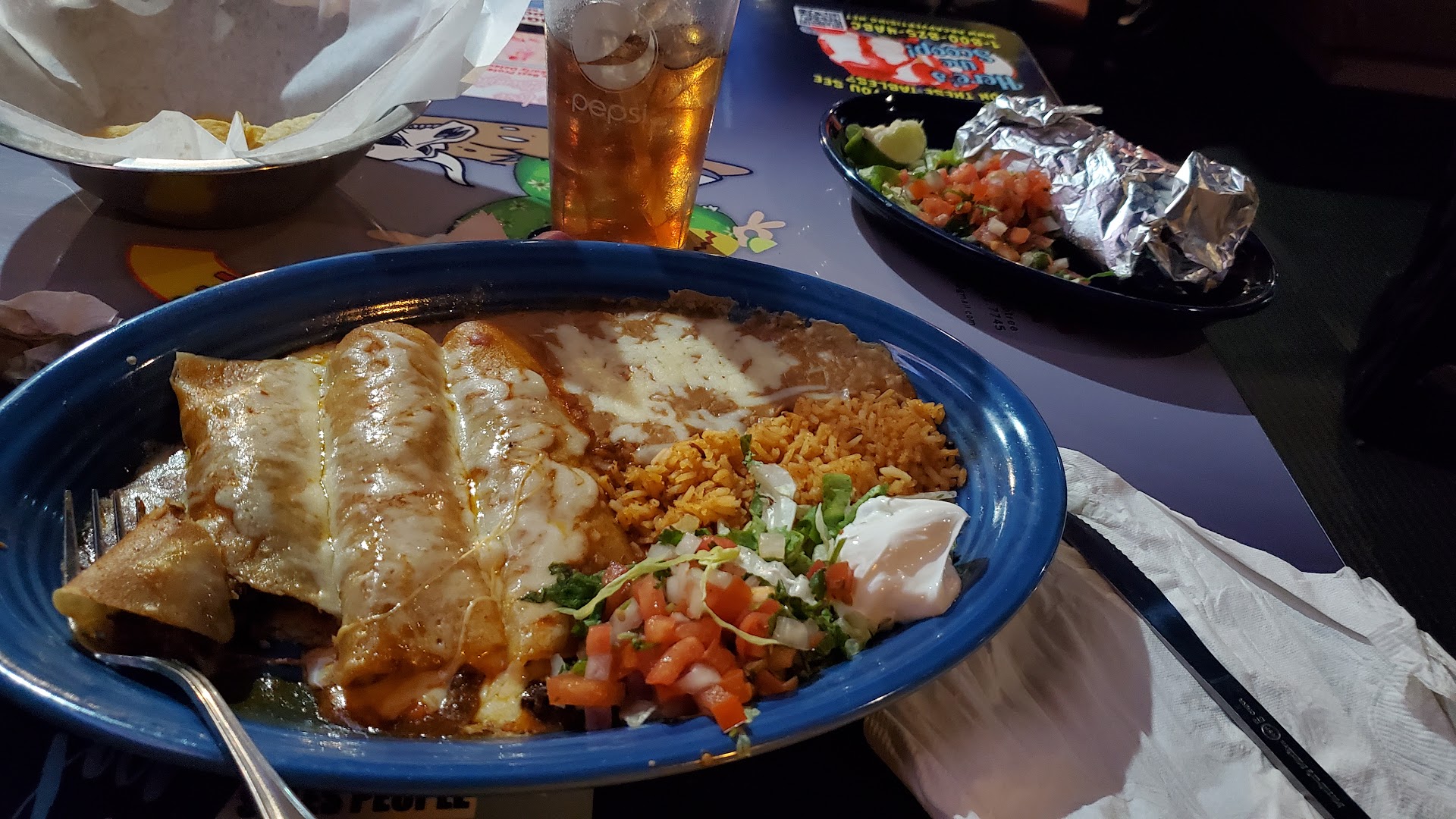 Read moreMaybe they serve different food for ppl who order to go? Worst "mexican"resturant EVER! Seriously...Taco Bell is better! There is nothing authentic about this place except the chips and the decorations. Everything else is a cheap knock off. ALL the walls are terribly dirty...so is the bathroom. I was weary of eating here with viruses being spread so much these days...and my mom always said you can judge someone by the state of their bathroom and kitchen...but by that logic..this place should be shut down. Just walk in and look at ALL their walls. The dirt is caked on and look like they've never been cleaned. We asked if our order was right...the lady said..lets check. Shoulda been checked prior to bringing to the customer. My man is lactose intollerant and said no cheese or sour cream..they didn't put it outside..but added cheese inside his buritto. The burritos were soggy with grease and had no flavor.. Did they even use seasoning? Did the buy the tortillas from sunfresh?This was legit the worst place to eat mexican food in kcmo. Dont go unless you want a disease or unless you have no taste buds or like wasting money. This would be a great place to order food for someone you dont like. Dirty..no flavor..drenched in oil...How are you guys still open?? Gordan Ramsy would revoke their hispanic cards in a heartbeat. But wanna charge 10 bucks for a lunch meal and didnt even provide a drink? Panchos is better...and they even took...