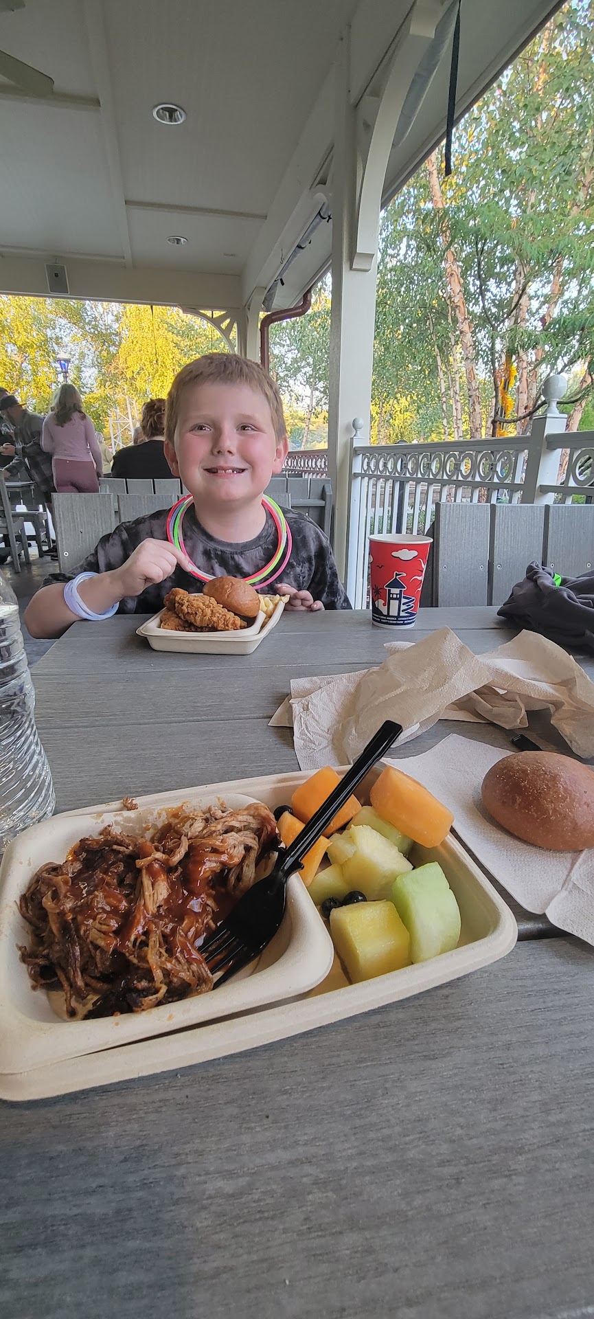 Read moreWe ate here for the first time during busy Halloween haunt. They were so fast. Our food was perfect. They even had chicken strips and fries for my kids. You can get a 1,2 or 3 meat platter. With the Gold pass you get the one meat platter. I chose brisket and fruit. They had 3 choices for BBQ sauce sweet, original or spicy. I got original. My brisket was so delicious. The chicken strips and fries were awesome. We had some of their waffle fries. My youngest is the pickiest kid ever and tore down the Mac and cheese. The meals average 21.99- 26.99. We have the gold pass with 2 free meals a day so we just got our food scanned and ate. Will definitely...
