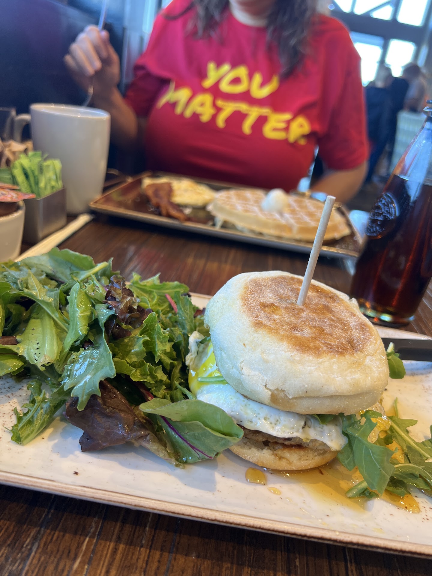 Read moreHorrible experience. Menu totally different and difficult to read and navigate. Parking is a nightmare, sharing it with a grocery store, so no where for us to park close due to shoppers at every other store sharing the same parking lot. Little to no extra space for anyone to sit while waiting inside, so standing outside is only option (no seating outside) if more than one party is waiting inside. No outdoor speaker, so soft spoken host calls names outside, barely able to hear him and people were skipped. Party of 11 was called for nearly 10 minutes before they would move onto next waiting group's name. Horrible layout for any croud control/flow. Paying where others are checking in etc. Seated with less glasses/mugs than our party had. Slow service. Food took longer than ideal to get, and then was less than eatable. Hair on sausages, sausage undercooked, breakfast potatoes squishy, greasy, undercooked. Scrambled eggs garnished with STRONG scallions, but this is not mentioned on menu as a garnish. I am allergic to them. Waffle was the only really enjoyable item we got. Glasses were filthy that were brought out, as kitchen "ran out of glasses" and had to speed clean them. Water in milk jar had floating debris... Other tables around us complained too. Seating is family style for a large wall, so we had to share our conversations with 4 other tables, and one large booth seat for us all to sit on together. All 3 of our meals were comped for our issues, and we will never be back again. Worst experience I've had in a restaurant, and we...