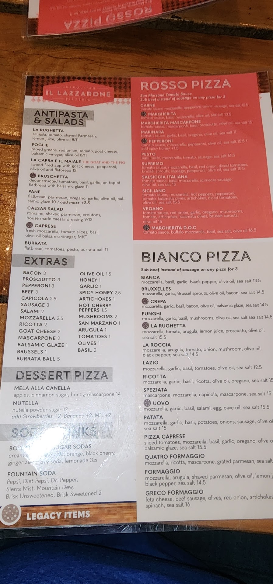 Read moreIf you are gluten sensitive, they offer cauliflower crust, which my wife and I have not gotten into (its a taste thing). When the bartender saw my reaction to cauliflower, he pointed out that their regular crust is very low in gluten so some people don't have a reaction (please stop saying this). I'm not gluten sensitive so I ordered their regular Carne pizza with a side Caesar salad. The salad looked very appealing, but the small rectangular platter it was served on was not the best choice since ingredients easily fell off the dish. I also prefer my greens to be cold, yet this salad was room temperature. As for taste, it was fine, but not close to the best I've had, but I consider this a personal preference and feel that most would really like it. As for the pizza, the flavor reminded me of the pizza chain called Sbarro. It had that similar crust like a New York style pizza (thin, but not stiff). There is just one pizza size option which might just be a little too large for some people. Due to the size, I expected it to be cut into 8 sections and feel that it would have been easier to eat this way, but it came out in four large sections and due to the limpness of the crust made the points difficult to eat without losing toppings. I'm not sure if you were to fold it like a New York style pizza since the amount of crust on the outside didn't look helpful to do so. The toppings were good and they appeared to be a good quality, but could have used a little more of everything (toppings, sauce and cheese). As for the restaurant, it is quite nice, although I couldn't help think that the nice bar towards the front would be more appealing to those passing by. If eating at the bar, no need to wait to be seated. I gave them 4 stars (I liked it), which I did. With so many other pizza places to try, I'm not sure I'll make it back to Il Lazzarone, but I enjoyed...
