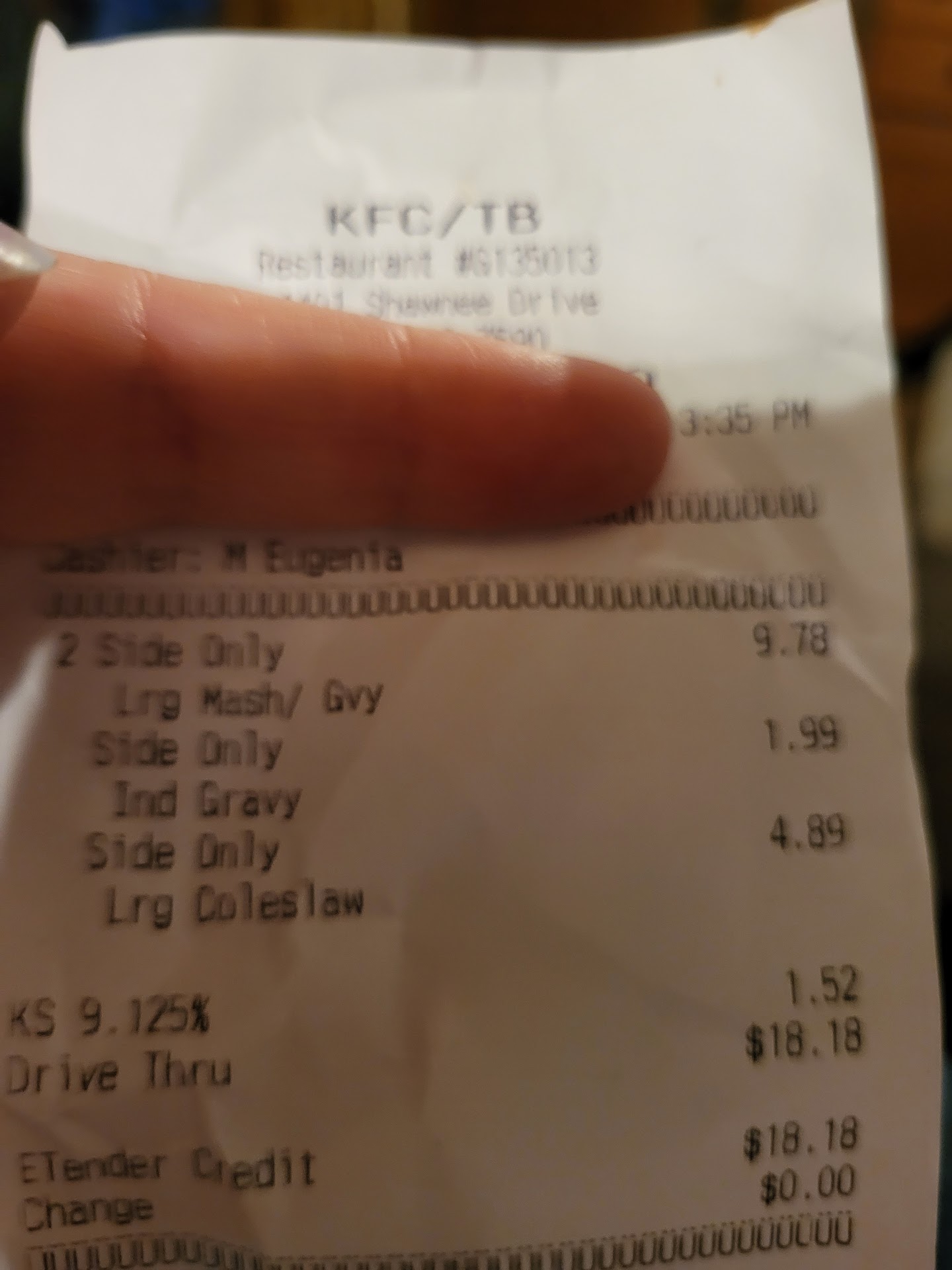 The rest of the team is worthless. In the last month we have had more than one issue. We contact corporate, who says a regional will call us yet they never do. 1. We never get what we order. 2. They never give the requested sauces and always forget gravy. 3. We've been served raw chicken which my kids almost ate. 4. They've refused to remake food when the wrong food was given to us. 5. They constantly refuse to make food if they've made too much of any kind of chicken. 6. Any taco bell food ends up without cheese in it (borritos, quesadillas, tacos etc). 7. They run out of types of drinks (Baja blast, a staple item) for days at a time. 8. They never never never give us a receipt, we always have to go back to get one after realising the order is wrong. 9. If you order Nashville chicken, you will get plain...
