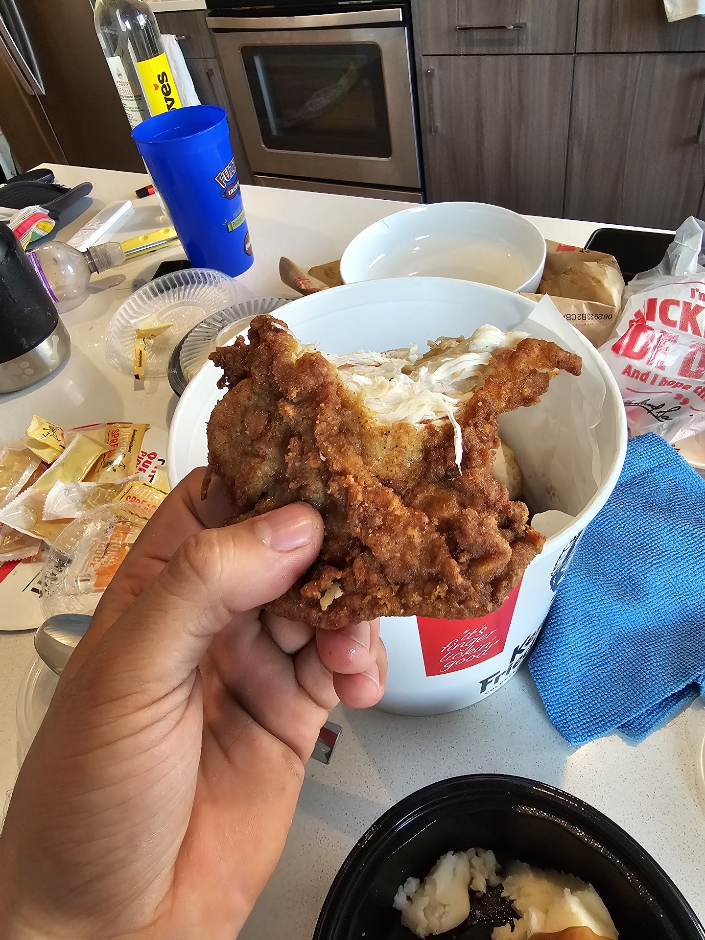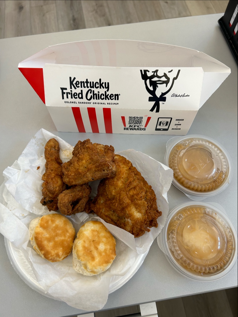 Read moreI went in about 5:30 in the afternoon thinking this would be the optimum time for everything being stocked for the dinner rush, and I wanted a 14 piece bucket half extra crispy and half original recipe. Now, the cashier was as helpful and apologetic as he could be, but they were out of white meat, and they were out of extra crispy. So, instead of getting only three or four pieces of dark meat original recipe get up with 14 pieces of dark meat original recipe. Now, you know that this means legs and backs. Mostly legs. There were three or four backs, but they were small. Also, to tell you the truth, the chicken needed to have been left in the cooker for a few more minutes. Didn't come apart the way it completely cooked chicken does, and certainly not the way it does on their commercials. Anyway, I had waited for a paycheck in order to give myself a special treat, Kentucky fried chicken, and to say I was disappointed would be an...