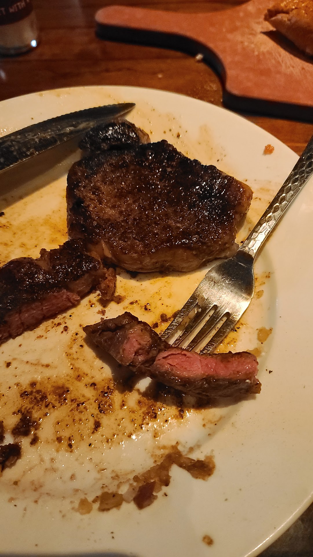 Read moreIt was our anniversary, so I was going to treat the wife to one of the high end steakhouses in KC. She had a headache, so wanted to go somewhere closer. I ordered the Porterhouse and she ordered the ribeye. I added on a 4 oz lobster tail, and 4 grilled shrimp. Their pre-meal bread is hot, fresh, and fabulous! Our server was courteous and professional. The Caesar salad was fresh and the dressing was superb. We ordered our steaks medium. Mine was perfect, hers was closer to medium rare. Normally I would have asked them to hit it with a little more heat, but it was clear most of it would be taken home and reheated...so it worked out perfectly. My lobster tail was done to perfection and I would guess was closer to 5 oz. The shrimp was slightly past being perfectly done, but still very good. As it was our Anniversary, the manager asked if she could treat us to dessert. This is my only real complaint about our night... FALSE ADVERTISING! I ordered the Chocolate Stampede. It was advertised as a 2 person dessert. Maybe if the 2 people were offensive linemen for the Chiefs...and they just came for dessert! It was delicious, and with the two scoops of Vanilla bean Ice Cream...had to weigh 2 lbs. If you have a party of 4-6 people...he dessert portion is perfect. We took more than half home. So not truly a complaint. We drink water with our meals (boring, I know) and dessert was free. Our bill came to $82! The place I had originally planned on taking her had steaks that were $56-$120. Would we have noticed a difference in the cut of meat? Probably marginally...but for the service, quality, and price all taken into consideration...Longhorn was a grand slam home run. We had a very memorable...