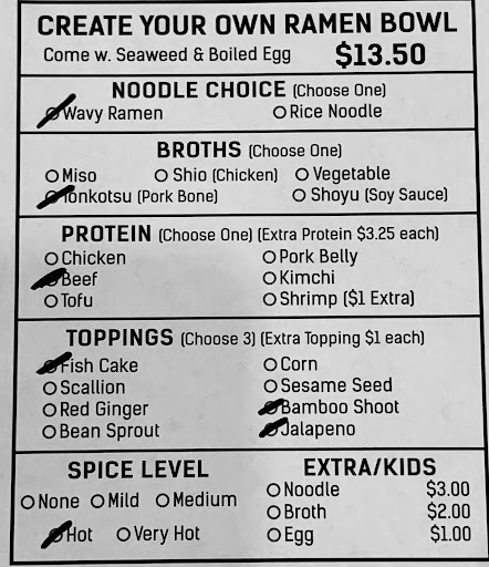 The order taker gives you a sharpie and two sheets of paper similar to a happy horror menu. You completely customize your Ramen Bowl and Boba Tea (though no boba ironically). They have a lot of options for the actual bowl as well as if you just want noodles or want some Appetizers.