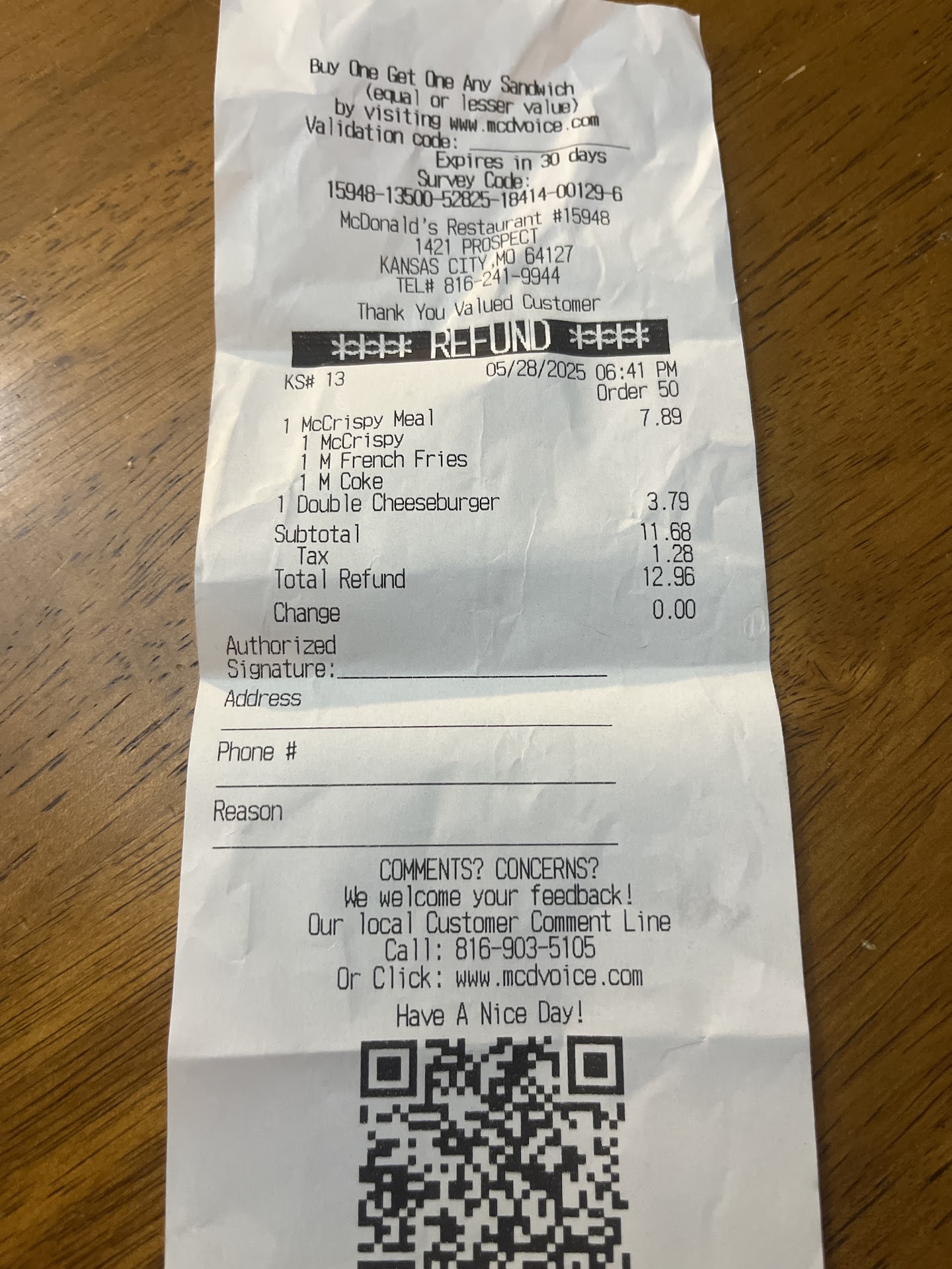 I stopped in this evening and I ordered through the drive thru. I ordered a #4 original chicken sandwich meal and a double cheeseburger. I pulled up to the first window and paid in cash. I handed the lady a 20.00 and she gave me my correct change. I thanked her and pulled forward at the next window this is where things got completely messed up. The girl at the window hands me a coke and a little bag with what looked like a biscuit. I handed her back the bag and explained that is not what I ordered she then began to ask me what my problem was and all I could think about was the checkers employee who shot a customer for bringing an issue to the employees attention. Then a heavy set Hispanic kid and before this gets out of hand I am a Hispanic male, he begins to get rude with me and the he asked what the issue was and I told him and he said so what do you want me to do about it. I told him do your job and correct my order he laughed and said yea ok and continued to laugh. I then asked for my money back and he told me to pull forward and I asked for my receipt back and he refused. I pulled forward and he came out and took back the Coke which I was already holding out my window he then handed me 1.00 dollar and a receipt and walked away. He did give me a receipt for order 50 with a total refund 12.96 which he never gave me. I figured it wasn’t worth the hassle as the thieves in this establishment probably do this to a lot of customers. I would strongly advise the community to not patron this establishment as they are employing not so honest people and with the world in the chaos it’s in and after what happened to the customer at the checkers this place is not worth the hassle especially when there are other McDonald’s within 5-10 minutes from this location. At the bottom I attached a copy of the refund that he must have put into his pocket and only handed me a dollar and...