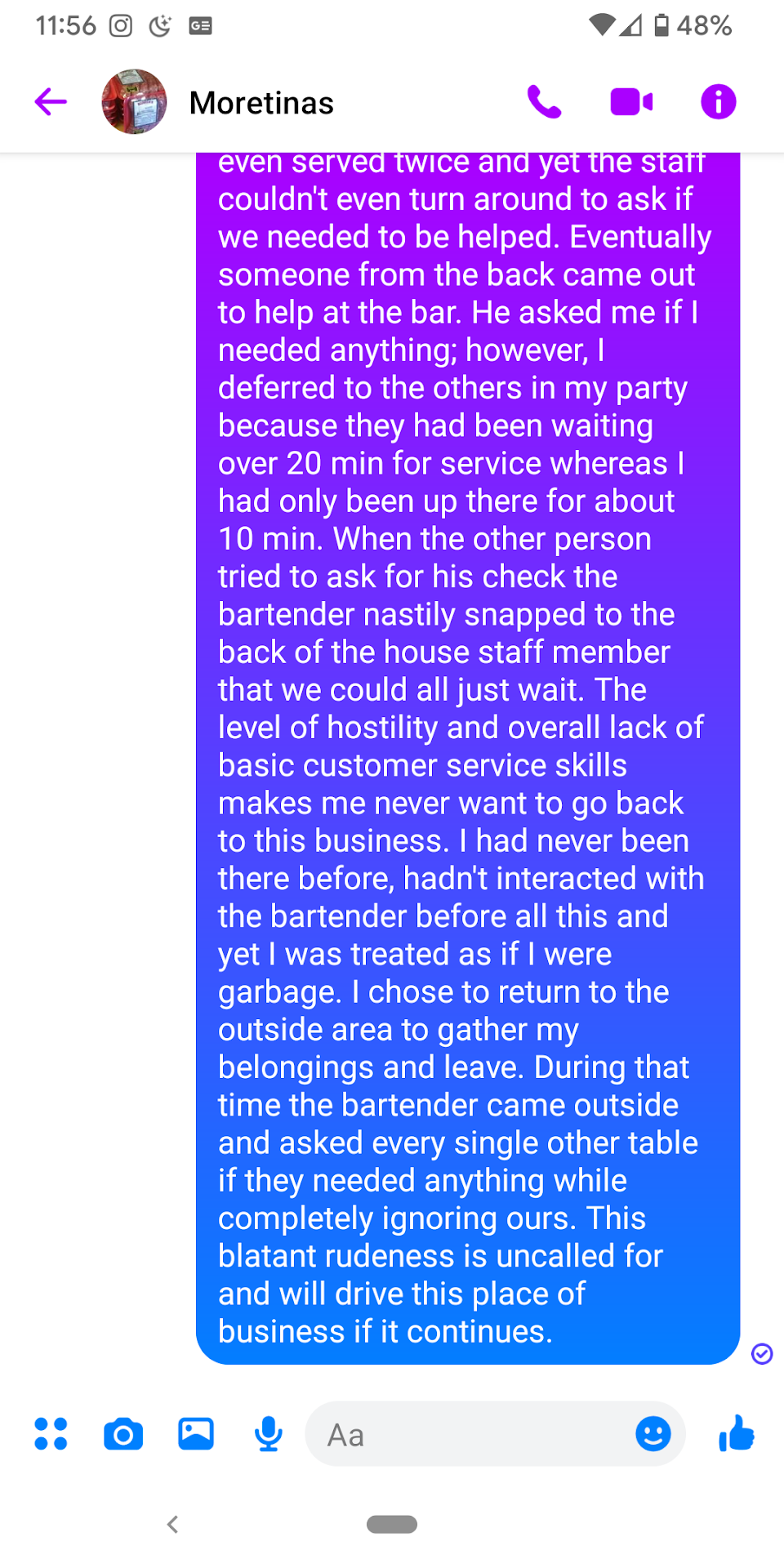 I visited this location this past Saturday with my boyfriend. We were meeting up with a few friends there and it was our first time visiting. The bartenders were absolutely horrible. We arrived a little later than everyone else & it was a bit busy. After we set down our stuff, we tried to go to the bar to order drinks. The bar staff intentionally refused to even acknowledge us. Some individuals on the other side of the bar were even served twice and yet the staff couldn't even turn around to ask if we needed to be helped. Eventually someone from the back came out to help at the bar. He asked me if I needed anything; however, I deferred to the others in my party because they had been waiting over 20 min for service whereas I had only been up there for about 10 min. When the other person tried to ask for his check the bartender nastily snapped to the back of the house staff member that we could all just wait. The level of hostility and overall lack of basic customer service skills makes me never want to go back to this business. I had never been there before, hadn't interacted with the bartender before all this and yet I was treated as if I were garbage. I chose to return to the outside area to gather my belongings and leave. During that time the bartender came outside and asked every single other table if they needed anything while completely ignoring ours. This blatant rudeness is uncalled for and will drive this place of business if...