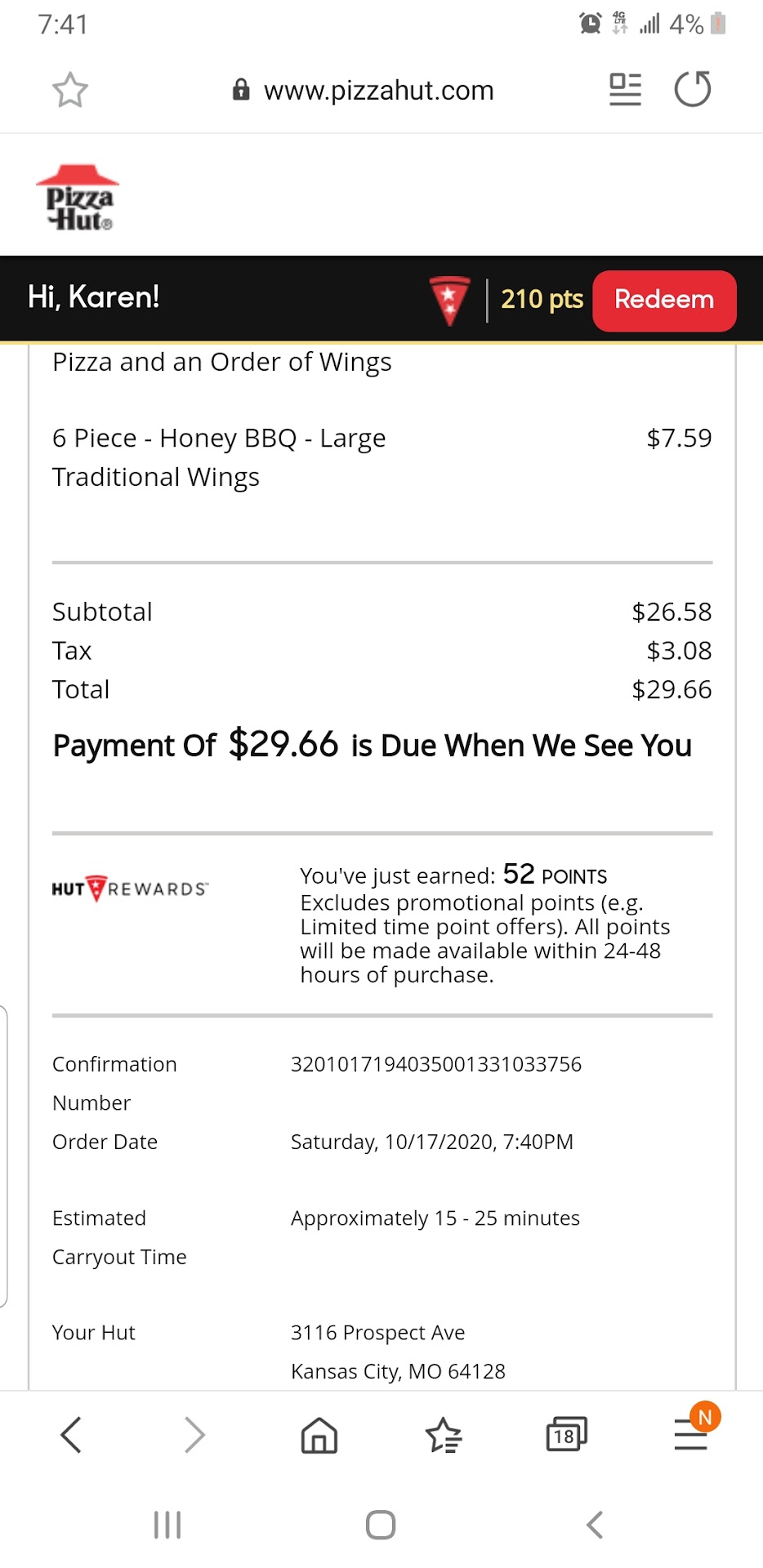 Read moreSad thing happened tonight I made an online order, which included a deal that had a large specialty pizza and 8 bone out wings for $18.99 then I ordered 8 more bone in wings. So my Husband and Son get there and they give him a personal pan pizza??? The the "GM" Which is in street clothes with a very bad attitude refuses to look at the screen shot I sent my Husband on his phone of the order with the confirmation number on it! I'm on Google Duo listening to the whole thing. How could a personal pan pizza with 8 bone out wings come to almost $30.00??? That makes no sense. My Husband kept his composure while still trying to get them to correct the order. I finally said give him back that personal pan pizza and get an ENTIRE refund! Today is 10-17-20 at 8:30pm on a Saturday night. That made no sense that he would charge almost $30 for a PERSONAL PAN and 8 bone out...