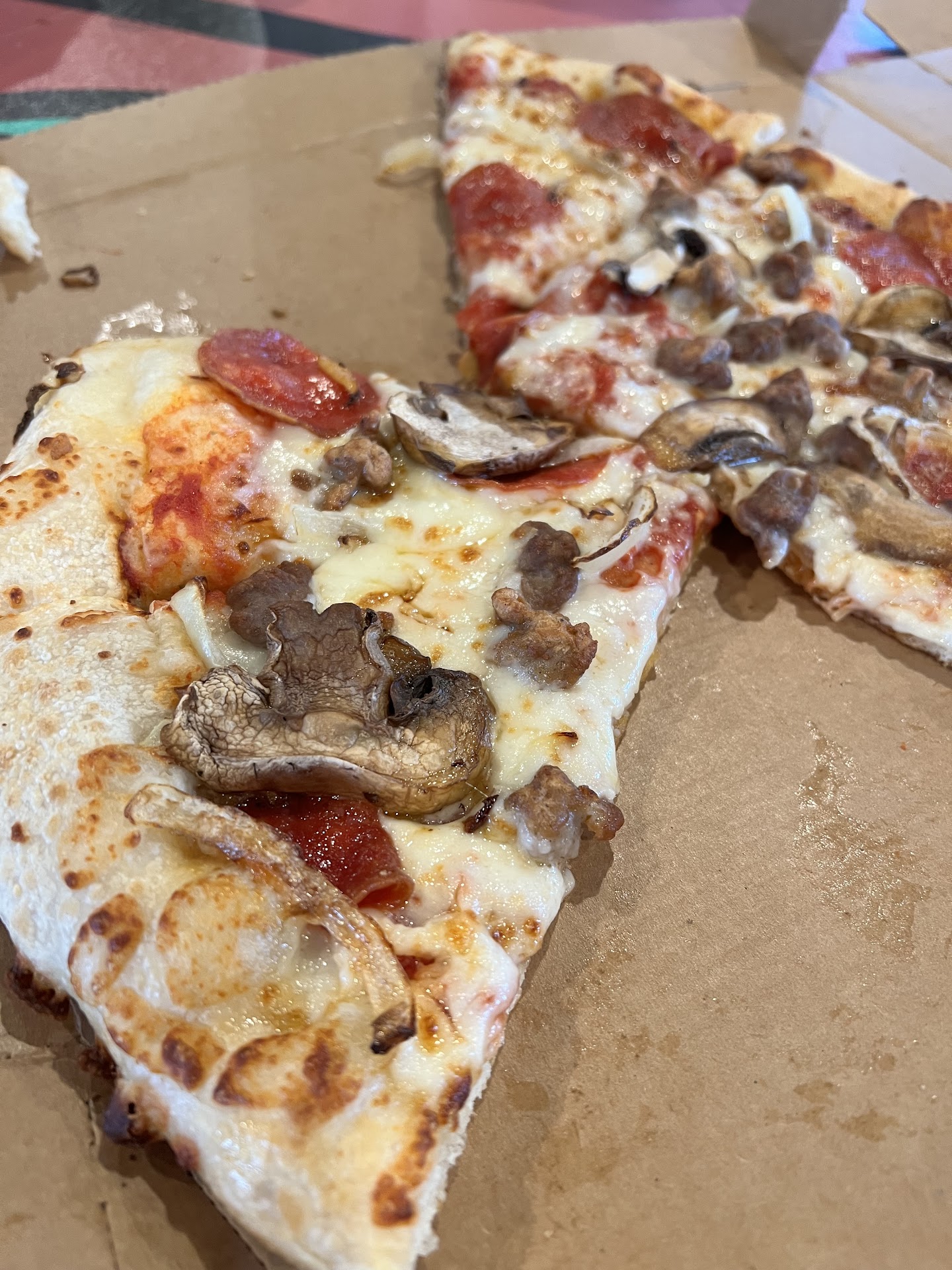 We ordered at 6pm through the app. we arrive 30 min later, 10 min after the app told us the pizza was ready. We waited in the drive thru line and when we got to the window it took several minutes for someone to come to the window after we rang the doorbell that was attached to the window with packing tape. We told them the name for the order, I paid, they told me they would be right back with my food.