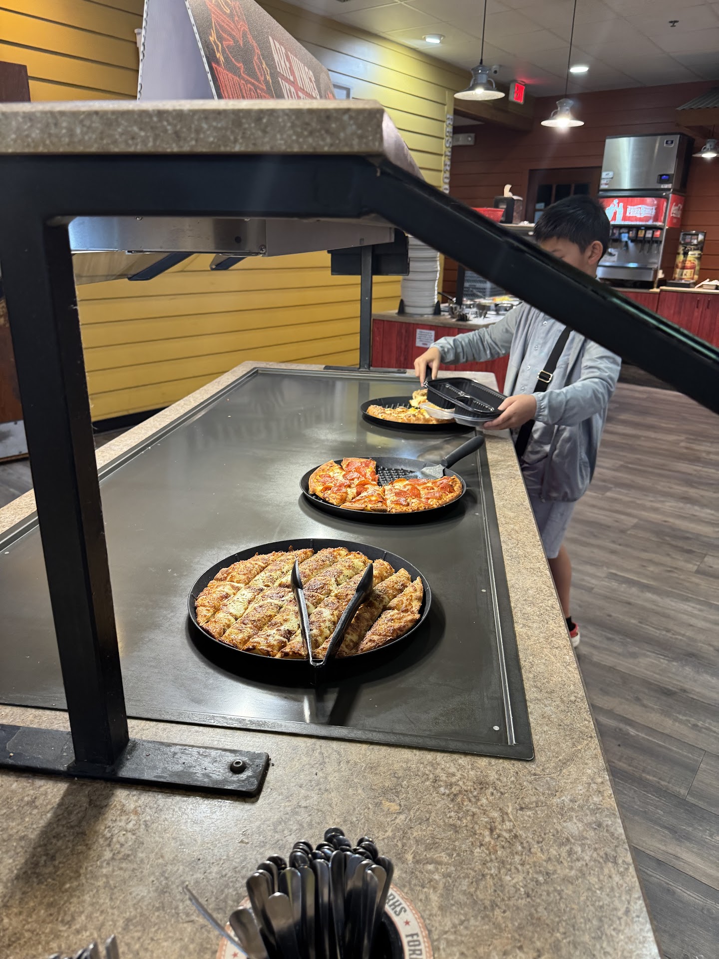 This was the first time we stopped in for the Thursday Wing Night. We got their before the rush, and the cashier, mentioned it had been slow all day. I went to the table my husband picked, I look down at see trash on the floor in two sections of the Dining Area where customers sit, had food & cup lid on the floor & other trash. ▪︎So I think to myself, if they were so Slow why is the Dining Floor so Dirty. ▪︎ I got some of the Different Wings: they were all cold. (not a one was "Hot" in Temperature. ▪︎ I am sorry this location dropped the ball Big Time. ▪︎Then I also got 2 chicken legs, they were hot "Temperature", I bite into them, and both of them: not cooked right, they were "Both Raw" in the middle, so of course (I spit back into a napkin). My husband got lucky and his Chicken Breast was hot & cooked correctly. No potato wedges or waffle fries. The stuffing & gravy were good also. ▪︎When we got there the Pizza buffet area was "Already Empty", they didn't have desert pizza or chocolate chip cookie either. The Salad Bar (was Out of lettuce- iceberg kind, and bearly had any of the other kind). Grated cheese & mushrooms were both almost out. No boiled Eggs (Use to have them). ▪︎They now had spot that had Coleslaw & Macaroni salad. (I tried the Macaroni salad it was good). I got the French dressing, it was like Watered Down (So sad)........ ▪︎They didn't even have "Lids" that Fit the containers where the coleslaw & macaroni on the salad bar. ▪︎No apples or oranges on the salad bar either. They never kept the desert Bar filled the entire time we were there.. ▪︎It was sad, folks pay good money to eat out, and provide a Meal for their families, and Get this Kind Bad of Service. ▪︎The Best Thing they had was a "Rootbeer Float" that I made up myself. Thank goodness there Soft Serve Ice Cream machine was working ☆☆☆. ▪︎I don't know if this location is under new management or they have No staff, This Location Needs some Major Help, So Beware.▪︎▪︎▪︎▪︎▪︎ ▪︎Hope management looks at...