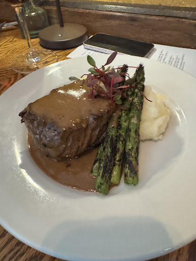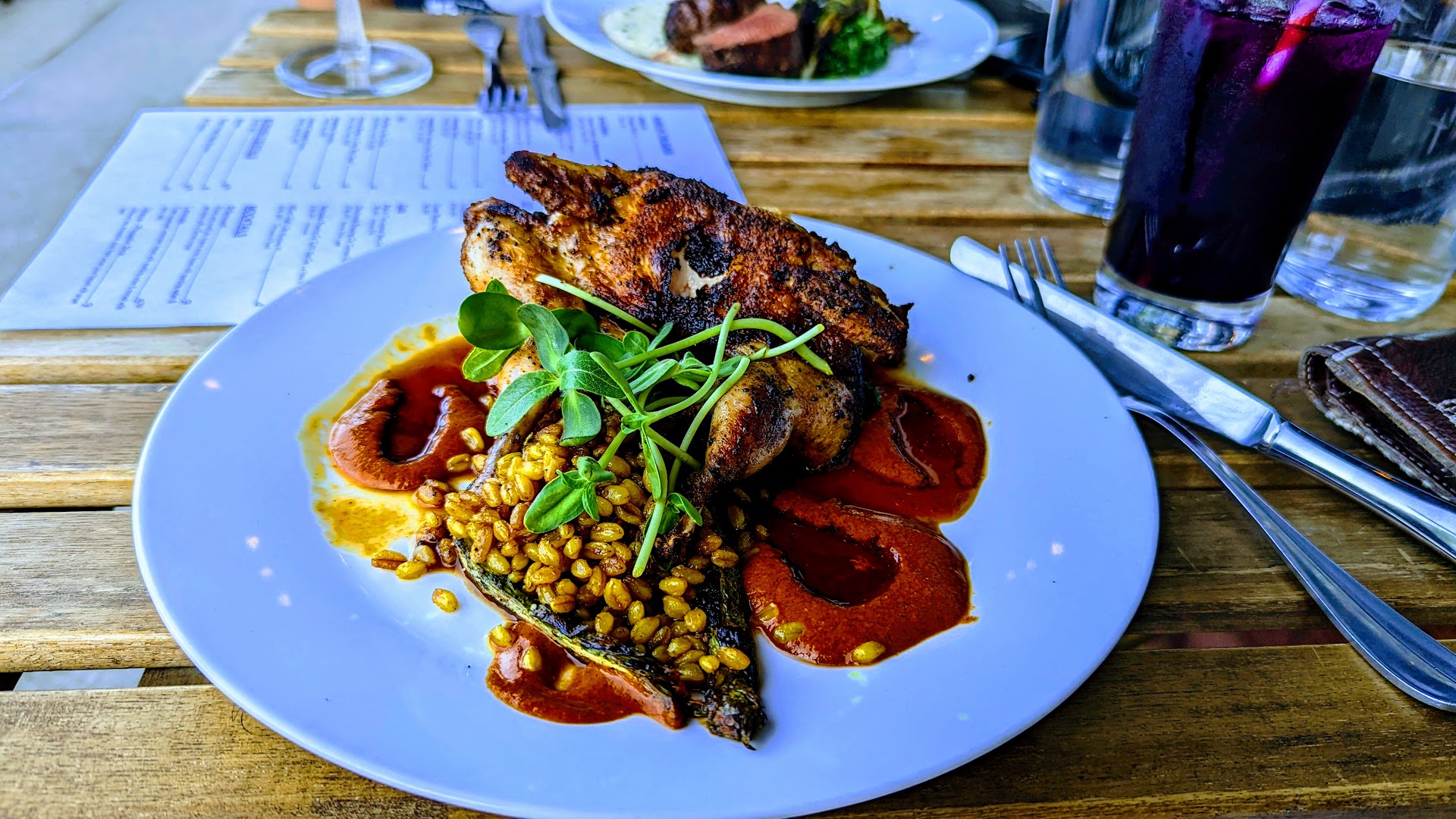 Food - I ordered the Pair of Spiced Quail (pictured) and he ordered the Filet au Poivre (refer to menu pic). He loved his meal! He said it was flavorful and not too spicy. The veg he enjoyed. But mostly the green peppercorn cream. However, he did expect more steak for the price he paid and it was a bit over cooked than what he asked for. The Pair of Quail were nicely seasoned and very well cooked. The farro and sorghum were great! I could have eaten that quail by itself without the sauce and it would have been brilliant. In fact, I should have eaten it without the harissa because that, for me, ruined the dish. The harissa teased me with smoky, spicy possibilities but it was a huge let down. There was no spice to it. There was flavor communicating spice should be here, but I was just left with sweetness throughout. I kept trying it hoping the spice would kick in but it never did. I'm not sure how they made their harissa but it just tasted like chili powder, paprika and brown sugar. Pretty to look at, not enjoyable to eat.