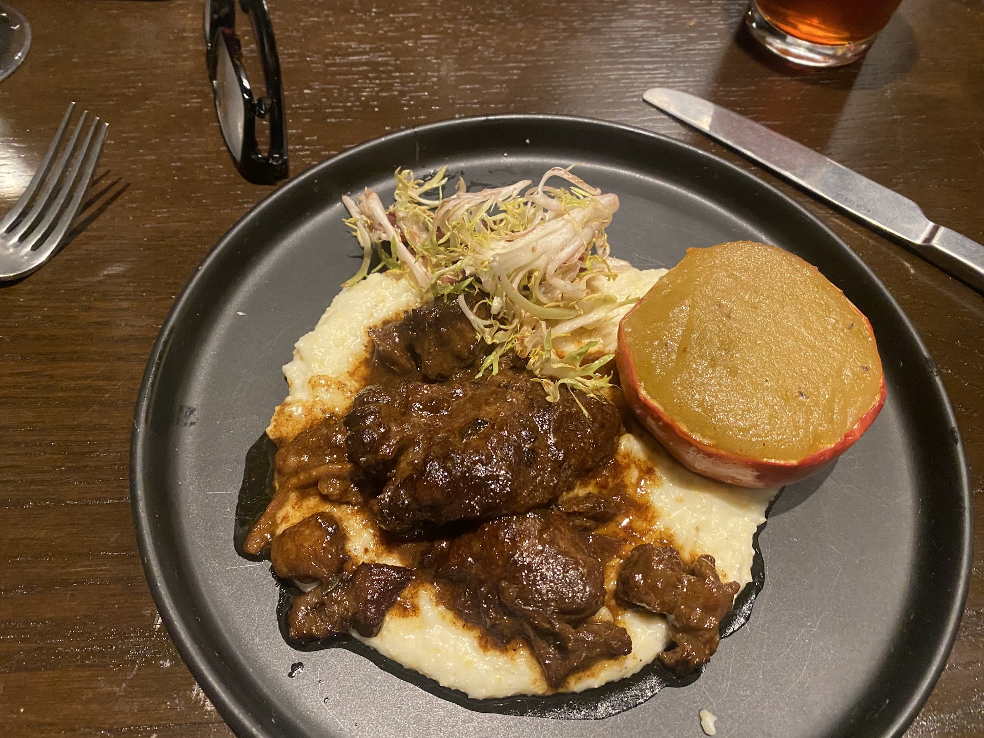 I ordered the cobia for the third course. It was overcooked, flavorless, and dry. The sauce underneath of it was hard to identify from a flavor perspective and didn’t really save the dish. I didn’t want to send another one back so I just didn’t eat it. On the other hand, my husband had the braised pork cheek and it was tender, juicy, and full of flavor. I was a bit jealous!