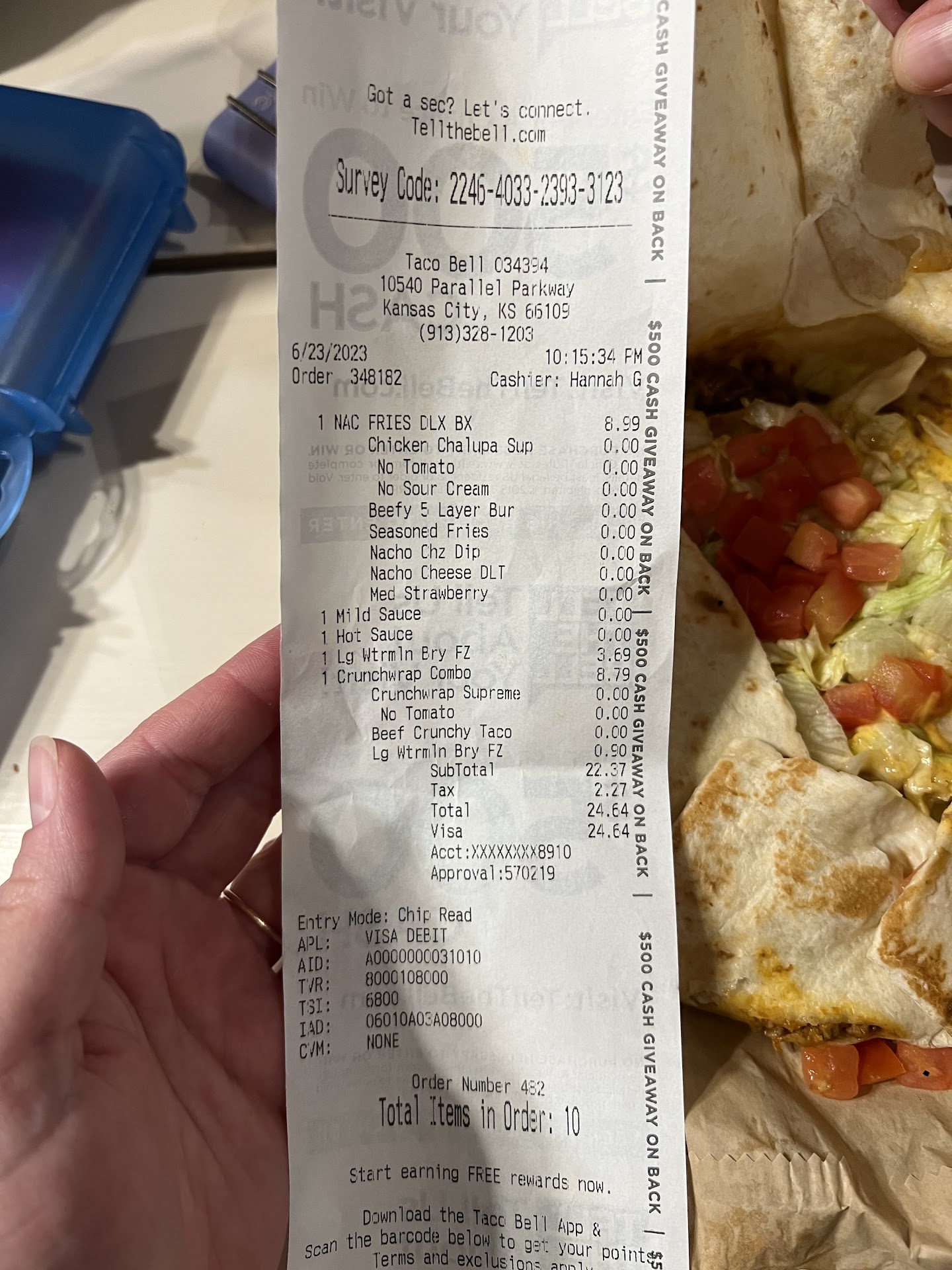 Read moreWe specifically stopped to have taco bell before going to a sporting event due to a coupon that we received for a 12 pack taco pack. When we arrived no one would help us and we waited quite a while for a employee to take our order. We had other patrons recommend to use the kiosk because no one would help them either. Unfortunately since we had a promotion we were forced to wait for someone to acknowledge us. Once we did we asked to upgrade our meal to have dorito taco shells and would pay the difference since the coupon indicated surcharges would apply if we upgraded to doritos. They informed us that they wouldnât be able to do so and we were welcome to purchase the doritos tacos separately and forfeit the coupon. We decided to go with the original and the gal walked off while glaring at us and never returned to complete our order. We then had to place the rest of our order on the kiosk because again we were being completely ignored with dirty looks. The food was fine but the service was terrible. They advise they are proud partners with KC Sports but we were treated poorly despite doing a promotion thru KC sports. I do not recommend this location unless you enjoy jumping thru hoops and being disrespected with...