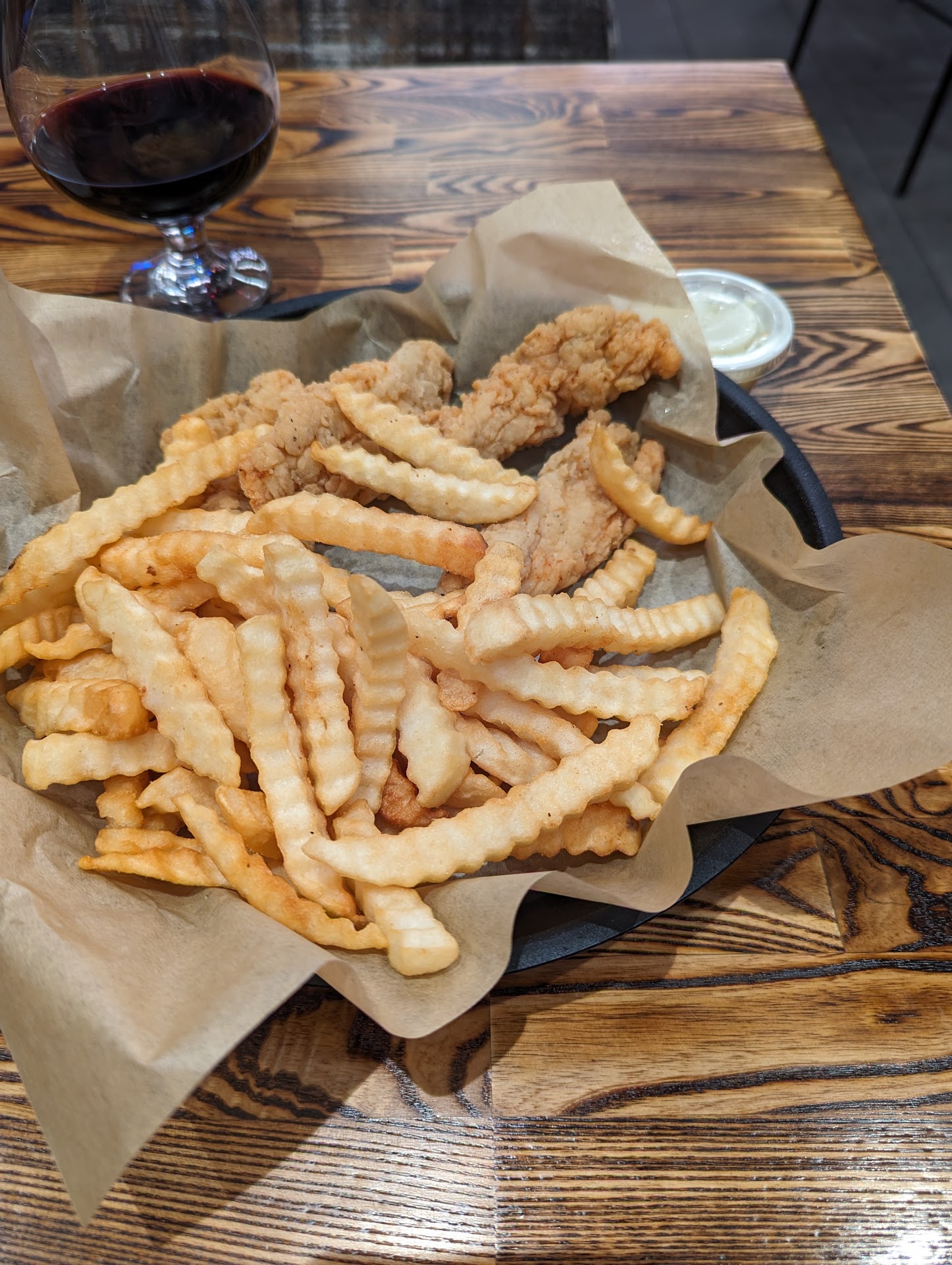 Menu is brief and bar and grill classics. I ordered the chicken fingers basket. That provided 4 average size chicken strips, a large order of fries and dipping sauce. The chicken, while it looked unappetizingly pale, was great - moist chicken with a flavorful, crispy breading. Fries were nothing special, will order them 'well done' the next time. The buffalo sauce was great.